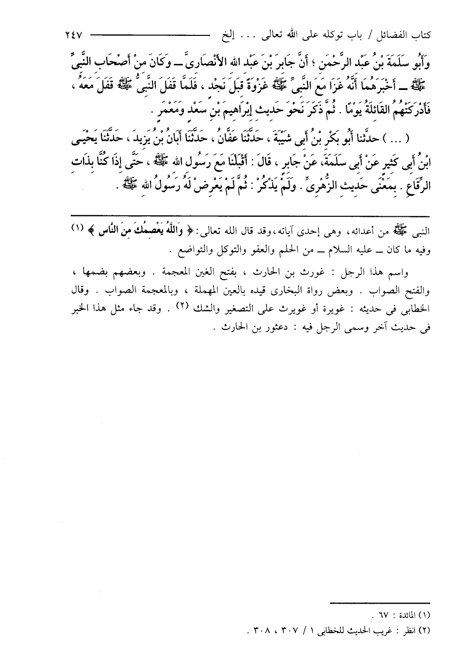 واسم هذا الرجل: غورث بن الحارث، بفتح الغين المعجمة. وبعضهم بضمها، والفتح الصواب. وبعض رواة البخارى قيده بالعين المهملة، وبالمعجمة الصواب. وقال الخطابى فى حديثه: غويرة أو غويرث على التصغير والشك (¬2). وقد جاء مثل هذا الخبر فى حديث آخر وسمى الرجل فيه: دعثور بن الحارث.