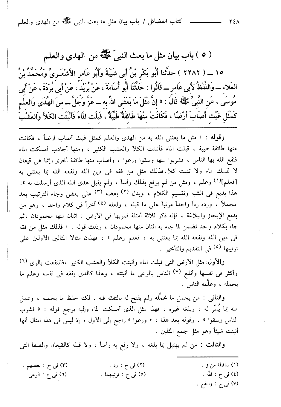 15 - (2282) حدَّثنا أَبُو بَكْرِ بْنُ أَبِى شَيْبَةَ وَأَبُو عَامِرٍ الأَشْعَرِىِّ وَمُحَمَّدُ بْنُ العَلاءِ - وَاللَّفْظُ لأَبِى عَامِرٍ - قَالُوا: حَدَّثَنَا أَبُو أُسَامَةَ، عَنْ بُرَيْدٍ، عَنْ أَبِى بُرْدَةَ، عَنْ أَبِى مُوسَى، عَنِ النَّبِىِّ صَلَّى اللَّهُ عَلَيْهِ وَسَلَّمَ قَالَ: " إِنَّ مَثَلَ مَا بَعَثَنِى اللهُ بِهِ - عَزَّ وَجَلَّ - مِنَ الهُدَى وَالعِلْمِ كَمَثَلِ غَيْثٍ أَصَابَ أَرْضًا، فَكَانَتْ مِنْهَا طَائِفَةٌ طَيِّبَةٌ، قَبِلَتِ المَاءَ فَأَنْبَتَتِ الكَلأَ وَالعشْبَ