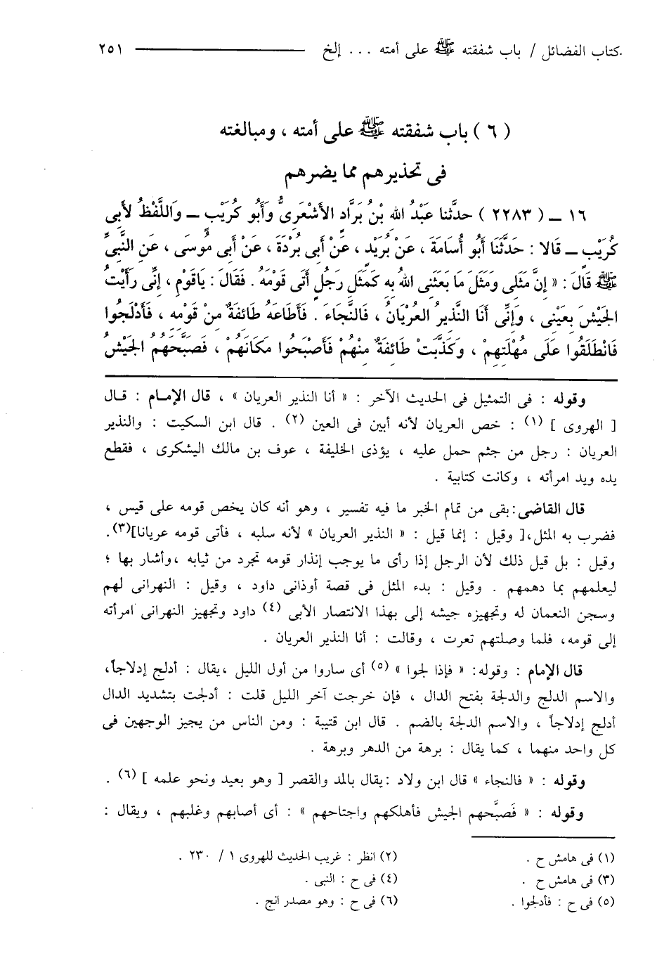 16 - (2283) حدَّثنا عَبْدُ اللهِ بْنُ بَرَّادٍ الأَشْعَرِىُّ وَأَبُو كُرَيْبٍ - وَاللَّفْظُ لأَبِى كُرَيْبٍ - قَالا: حَدَّثَنَا أَبُو أُسَامَةَ، عَنْ بُرَيْدٍ، عَنْ أَبِى بُرْدَةَ، عَنْ أَبِى مُوسَى، عَنِ النَّبَىِّ صَلَّى اللَّهُ عَلَيْهِ وَسَلَّمَ قَالَ: " إِنَّ مَثَلِى وَمَثَلَ مَا بَعَثَنِى اللهُ بِهِ كَمَثَلِ رَجُلٍ أَتَى قَوْمَهُ. فَقَالَ: يَا قَوْمِ، إِنِّى رَأَيْتُ الجَيْشَ بِعَيْنِى، وَإِنِّى أَنَا النَّذِيرُ العُرْيَانُ، فَالنَّجَاءَ. فَأَطَاعَهُ طَائِفَةٌ مِنْ قَوْمِهِ، فَأَدْلَجُوا فَانْطَلَقُوا عَلَى مُهْلَتِهِمْ، وَكَذَّبَتْ طَائِفَةٌ مِنْهُمْ فَأَصْبَحُوا مَكَانَهُمْ، فَصَبَّحَهُمُ الجَيْشُ