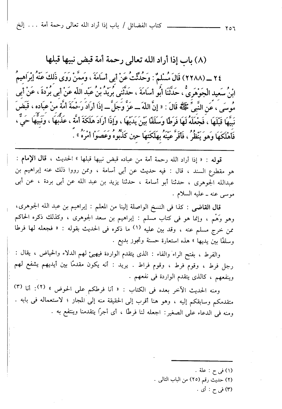 قال القاضى: كذا فى النسخ الواصلة إلينا من المعلم: إبراهيم بن عبد الله الجوهرى، وهو وَهْم، وإنما هو فى كتاب مسلم: إبراهيم بن سعد الجوهرى، وكذلك ذكره الحاكم ممن خرج مسلم عنه، وقد بين عليه (¬1) ما ذكره فى الحديث بقوله: " فجعله لها فرطًا وسلفًا بين يديها " هذه استعارة حسنة وتجوز بديع.