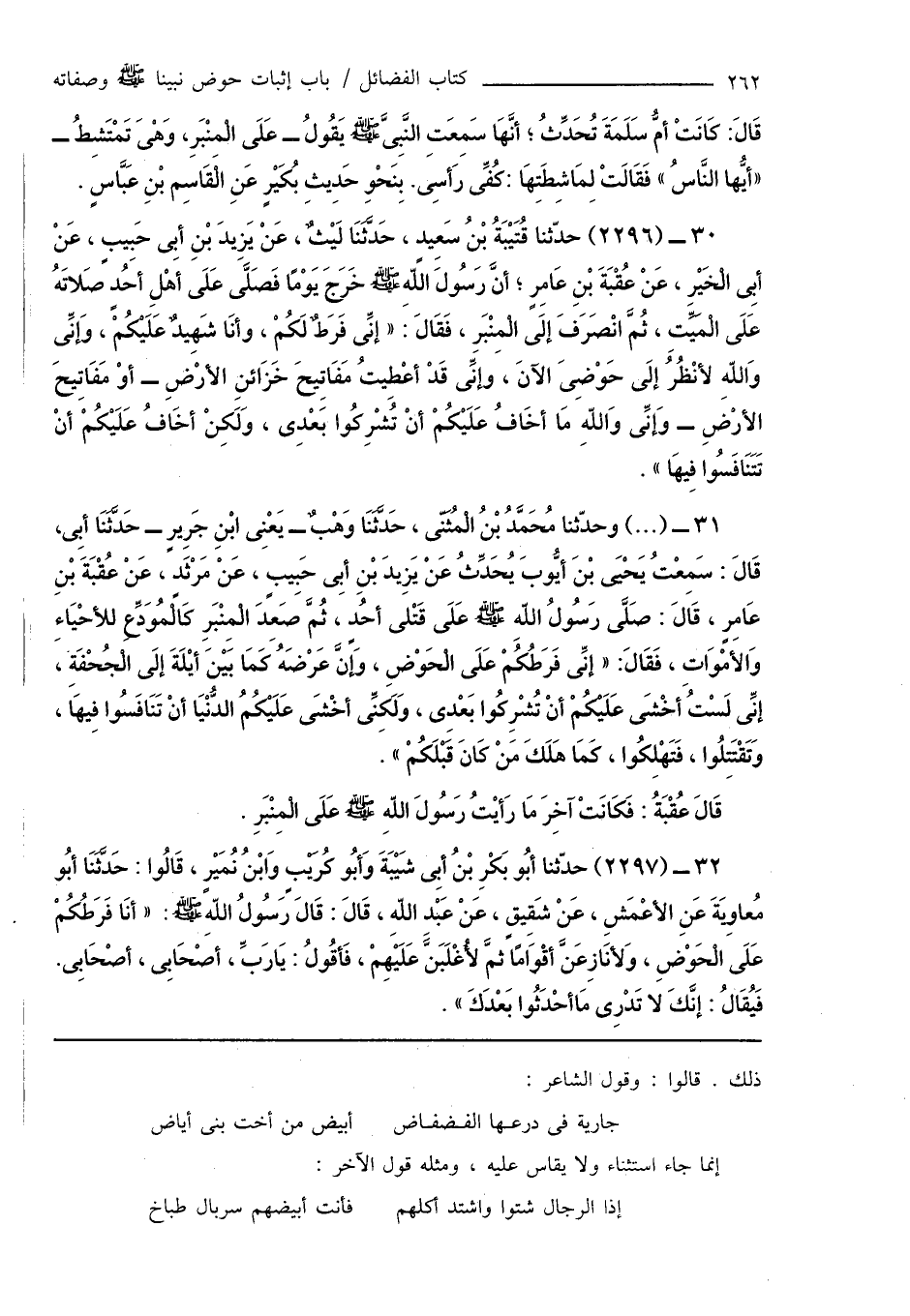 30 - (2296) حدّثنا قُتَيْبَةُ بْنُ سَعِيدٍ، حَدَّثَنَا لَيْثٌ، عَنْ يَزِيدَ بْنِ أَبِى حَبِيبٍ، عَنْ أَبِى الْخَيْرِ، عَنْ عُقْبَةَ بْنِ عَامِرٍ؛ أَنَّ رَسُولَ اللهِ صَلَّى اللَّهُ عَلَيْهِ وَسَلَّمَ خَرَجَ يَوْمًا فَصَلَّى عَلَى أهْلِ أحُدٍ صَلاتَهُ عَلَى الْمَيِّتِ، ثُمَّ انْصَرَفَ إلَى الْمِنْبَرِ، فَقَالَ. " إنِّى فَرَطٌ لَكُمْ، وأنَا شَهِيدٌ عَلَيْكُمْ، وَإنِّى وَاللهِ لأنْظُرُ إلَى حَوْضِىَ الآنَ، وإنَّى قَدْ أعْطِيتُ مَفَاتِيحَ خَزَائنِ الأرْضِ - أَوْ مَفَاتِيحَ الأَرْضِ - وَإنِّى وَاللهِ مَا أخَافُ عَلَيْكُمْ أَنْ تُشْرِكُوا بَعْدِى، وَلَكِنْ أخَافُ عَلَيْكُمْ أَنْ تَتَنَافَسُوا فِيهَا ".