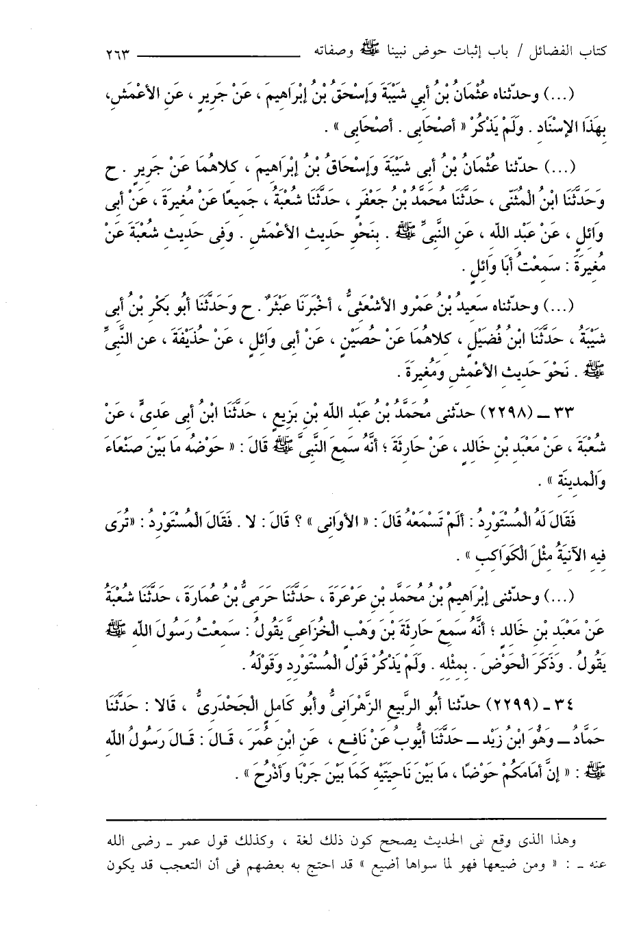 (...) وحدّثنى إبْرَاهِيمُ بْنُ مُحَمَّدِ بْنِ عَرْعَرَةَ، حَدَّثَنَا حَرَمِىُّ بْنُ عُمَارَةَ، حَدَّثَنَا شُعْبَةُ عَنْ مَعْبَدِ بْنِ خَالِدٍ؛ أَنَّهُ سَمِعَ حَارِثَةَ بْنَ وَهْبٍ الْخُزَاعِىَّ يَقُولُ: سَمِعْتُ رَسُولَ اللهِ صَلَّى اللَّهُ عَلَيْهِ وَسَلَّمَ يَقُولُ. وَذَكَرَ الْحَوْضَ. بِمِثْلِهِ. وَلَمْ يَذْكُرْ قَوْل الْمُسْتَوْرِدِ وَقَوْلَهُ.