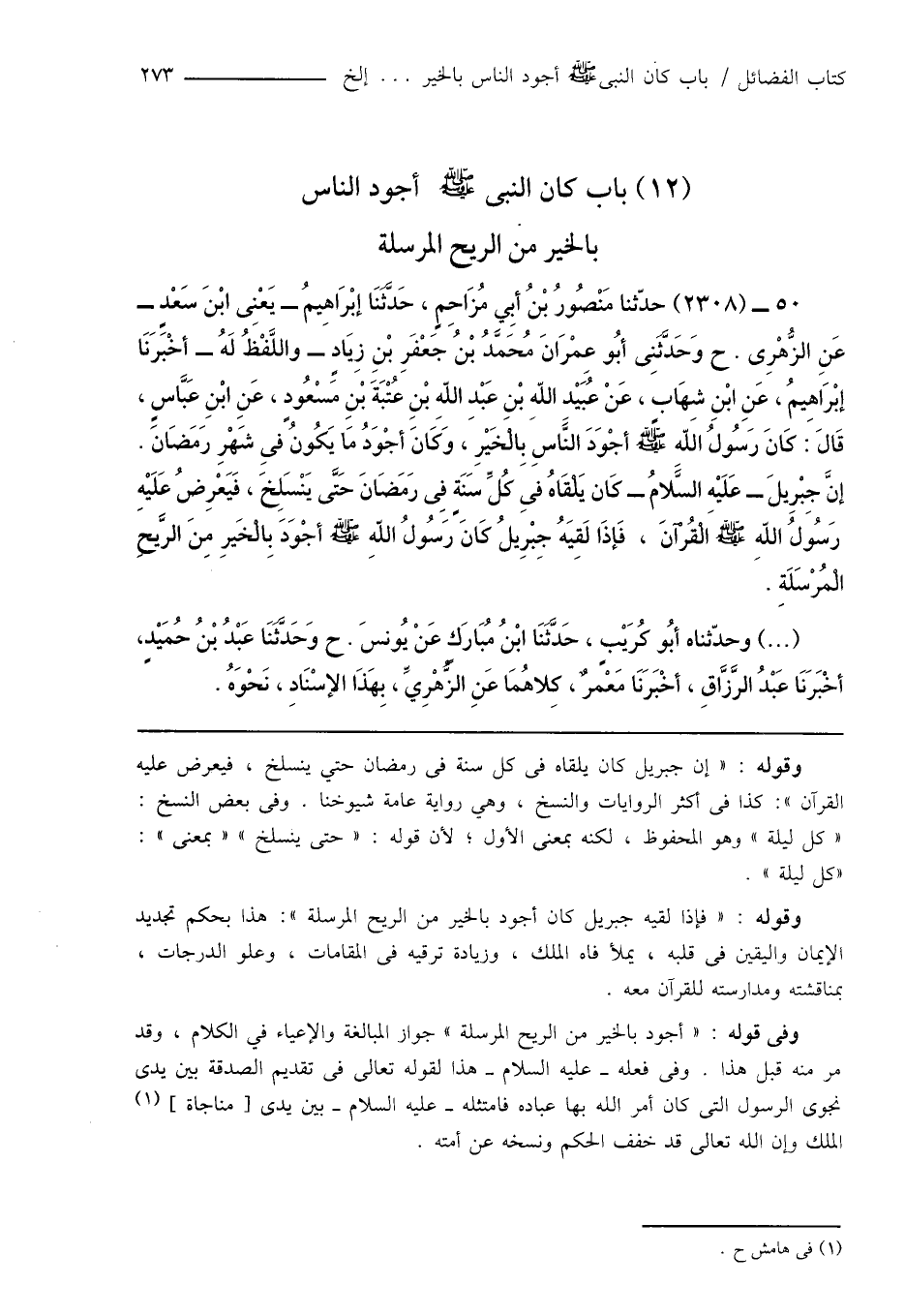 50 - (2308) حدّثنا مَنْصُورُ بْنُ أَبِى مُزَاحِمٍ، حَدَّثَنَا إبْرَاهِيمُ - يَعْنِى ابْنَ سَعْدٍ - عَنِ الزُّهْرِى. ح وَحَدَّثَنِى أَبُو عِمْرَانَ مُحَمَّدُ بْنُ جَعْفَرِ بْنِ زِيَادٍ - واللَّفْظُ لَهُ - أَخْبَرَنَا إبْرَاهيمُ، عَنِ ابْنِ شِهَابٍ، عَنْ عُبَيْدِ اللهِ بْنِ عَبْدِ اللهِ بْنِ عُتْبَةَ بْنِ مَسْعُودٍ، عَنِ ابْنِ عَبَّاسٍ، قَالَ: كَانَ رَسُولُ اللهِ صَلَّى اللَّهُ عَلَيْهِ وَسَلَّمَ أجْوَدَ النَّاسِ بِالْخَيْرَ، وَكَانَ أجْوَدُ مَا يَكُونُ فىِ شَهْرِ رَمَضَانَ. إِنَّ جِبْرِيلَ - عَلَيْهِ السَّلامُ - كَان يَلْقَاهُ فِى كُلِّ سَنَةٍ فِى رَمَضَانَ حَتَّى يَنْسَلِخَ، فَيَعْرِضُ عَلَيْهِ رَسُولُ الله صَلَّى اللَّهُ عَلَيْهِ وَسَلَّمَ الْقُرْآنَ، فَإِذَا لَقِيَهُ جِبْرِيلُ كَانَ رَسُولُ اللهِ صَلَّى اللَّهُ عَلَيْهِ وَسَلَّمَ أجْوَدَ بِالْخَيرِ مِنَ الرَّيحِ الْمُرْسَلَةِ.