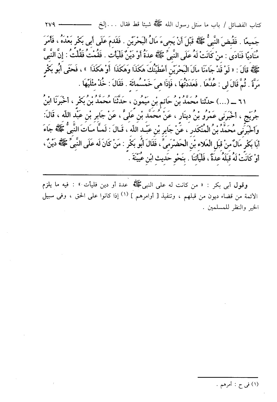 61 - (...) حدّثنا مُحَمَّدُ بْنُ حَاتِمِ بْنِ مَيْمُونٍ، حَدَّثَنَا مُحَمَّدُ بْنُ بَكْرٍ، أَخْبَرَنَا ابْنُ جُرَيْجٍ، أخْبَرَنِى عَمْرُو بْنُ دِينَارٍ، عَنْ مُحَمَّدِ بْنِ عَلِىٍّ، عَنْ جَابِرِ بْنِ عَبْدِ اللهِ، قَالَ: وَأخْبَرَنِى مُحَمَّدُ بْنُ الْمُنْكَدِرِ، عَنْ جَابِرِ بْنِ عَبْدِ اللهِ، قَالَ: لَمَّا مَاتَ النَّبِىُّ صَلَّى اللَّهُ عَلَيْهِ وَسَلَّمَ جَاءَ أَبَا بَكْرٍ مَالٌ مِنْ قِبَلِ الْعَلاءِ بْنِ الْحَضْرَمِىِّ، فَقَالَ أَبُو بَكْرٍ: مَنْ كَانَ لَه عَلَى النَّبِىِّ صَلَّى اللَّهُ عَلَيْهِ وَسَلَّمَ دَيْنٌ، أَوْ كَانَتْ لَهُ قِبَلَهُ عِدَةٌ، فَلْيَأتِنَا. بِنَحْوِ حَدِيثِ ابْنِ عُيَيْنَةَ.