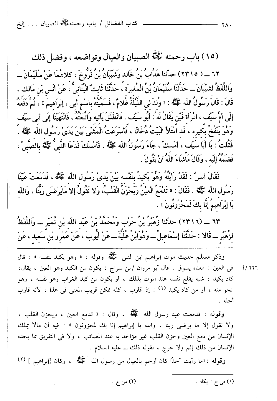 62 - (2315) حدّثنا هَدَّابُ بْنُ خَالِدٍ وَشَيْبَانُ بْنُ فَرُّوخَ، كِلاهُمَا عَنْ سُلَيْمَانَ - وَاللَّفْظُ لِشَيْبَانَ - حَدَّثَنَا سُلَيْمَانُ بْنُ الْمُغِيرَةِ، حَدَّثَنَا ثَابِتٌ الْبُنَانِىُّ، عَنْ أَنَسِ بْنِ مَالِكٍ، قَالَ: قَالَ رَسُولُ اللهِ صَلَّى اللَّهُ عَلَيْهِ وَسَلَّمَ: " وُلِدَ لِى اللَّيْلَةُ غُلامٌ، فَسَمَّيْتُهُ بِاسْمِ أَبِى، إبْرَاهِيمَ "، ثُمَّ دَفَعَهُ إلَى أمِّ سَيْفٍ، امْرَأَةِ قَيْنٍ يُقَالُ لَهُ: أَبُو سَيْفٍ. فَانْطَلَقَ يَأتِيهِ وَاتْبَعْتُهُ، فَانْتَهَيْنَا إلَى أَبِى سَيْفٍ وَهُوَ يَنْفُخُ بِكِيرِهِ، قَدِ امْتَلأَ الْبَيْتُ دُخَانًا، فَأسْرَعْتُ الْمَشْىَ بَيْنَ يَدَىْ رَسُولِ اللهِ صَلَّى اللَّهُ عَلَيْهِ وَسَلَّمَ. فَقُلْتُ: يَا أَبَا سَيْفٍ، أمْسِكْ، جَاءَ رَسُولُ اللهِ صَلَّى اللَّهُ عَلَيْهِ وَسَلَّمَ. فَأمْسَكَ فَدَعَا النَّبِىُّ صَلَّى اللَّهُ عَلَيْهِ وَسَلَّمَ بِالصَّبِىِّ، فَضَمَّهُ إلَيْهِ، وَقَالَ مَا شَاءَ اللَّهُ أَنْ يَقُولَ.