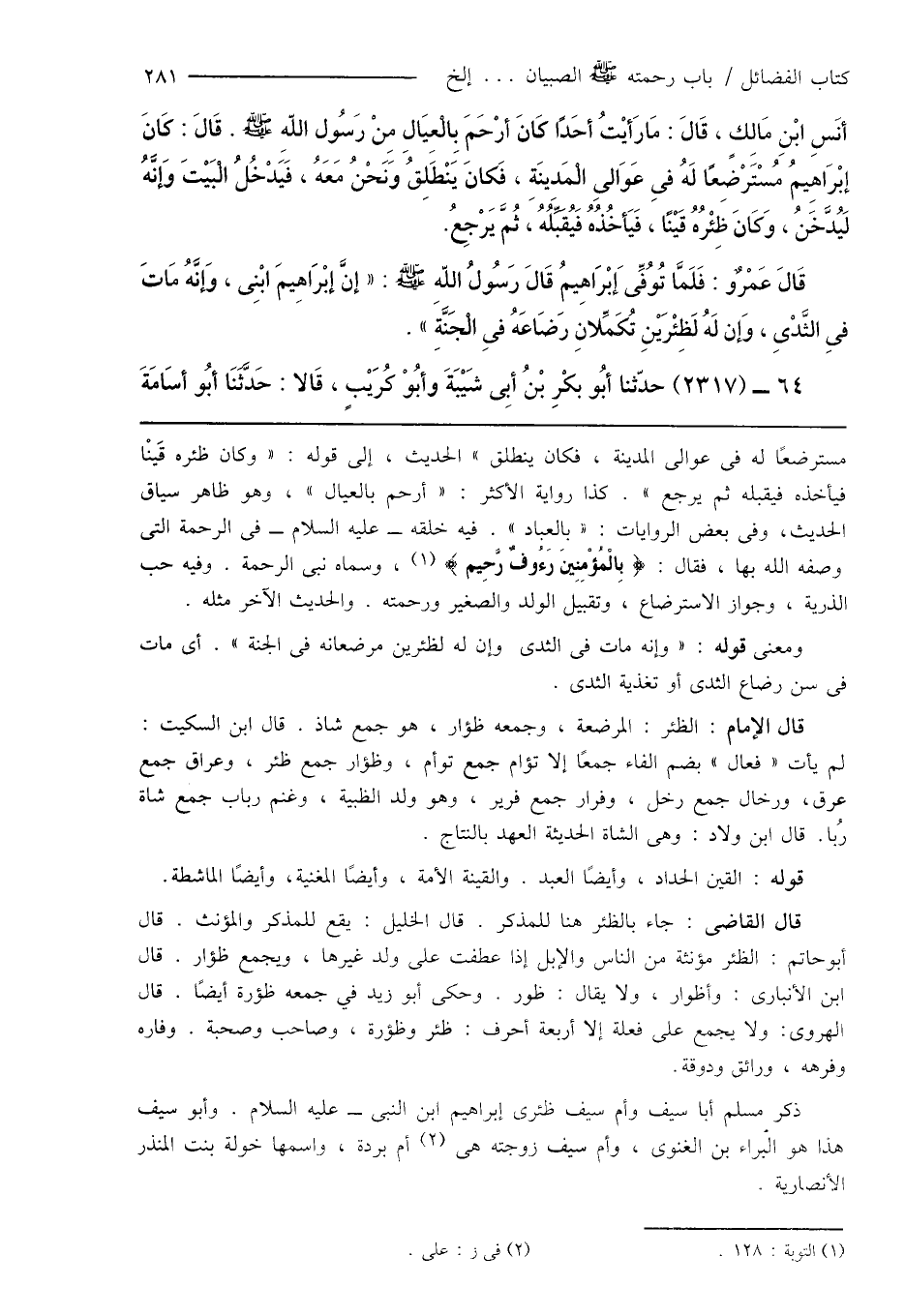 مسترضعًا له فى عوالى المدينة، فكان ينطلق " الحديث، إلى قوله: " وكان ظئره قَينْا فيأخذه فيقبله ثم يرجع ". كذا رواية الأكثر: " أرحم بالعيال "، وهو ظاهر سياق الحديث، وفى بعض الروايات: " بالعباد ". فيه خلقه - عليه السلام - فى الرحمة التى وصفه الله بها، فقال: {بِالْمُؤْمِنِينَ رَءُوفٌ رَّحِيم} (¬1)، وسماه نبى الرحمة. وفيه حب الذرية، وجواز الاسترضاع، وتقبيل الولد والصغير ورحمته. والحديث الآخر مثله.