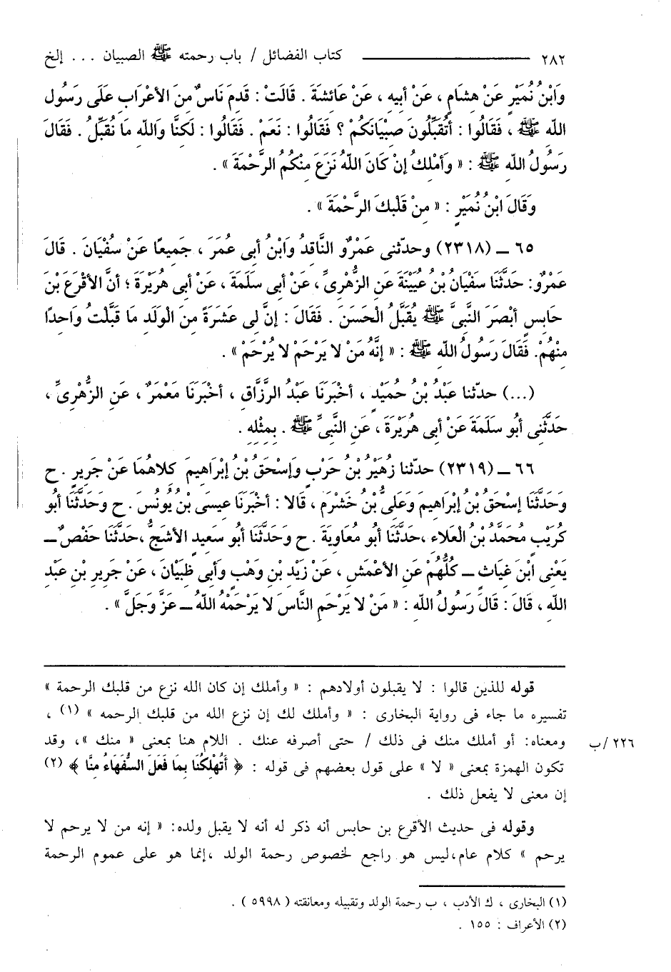 65 - (2318) وحدّثنى عَمْرٌو النَّاقِدُ وَابْنُ أَبِى عُمَرَ، جَمِيعًا عَنْ سُفْيَانَ. قَالَ عَمْرٌو: حَدَّثَنَا سفْيَانُ بْنُ عُيَيْنَةَ عَنِ الزُّهْرِىِّ، عَنْ أَبِى سَلَمَةَ، عَنْ أَبِى هُرَيْرَةَ؛ أَنَّ الأقْرَعَ بْنَ حَابِسٍ أبْصَرَ النَّبِىَّ صَلَّى اللَّهُ عَلَيْهِ وَسَلَّمَ يُقَبِّلُ الْحَسَنَ. فَقَالَ: إِنَّ لِى عَشَرَةً مِنَ الْوَلَدِ مَا قَبَّلْتُ وَاحِدًا مِنْهُمْ. فَقَالَ رَسُولُ اللهِ صَلَّى اللَّهُ عَلَيْهِ وَسَلَّمَ: " إنَّهُ مَنْ لا يَرْحَمْ لا يُرْحَمْ ".