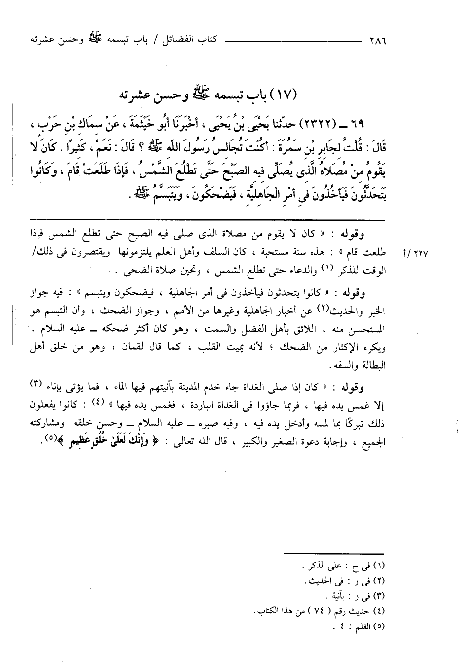 69 - (2322) حدّثنا يَحْيَى بْنُ يَحْيَى، أَخْبَرَنَا أَبُو خَيْثَمَةَ، عَنْ سِمَاكِ بْنِ حَرْبٍ، قَالَ: قُلْتُ لِجَابِرِ بْنِ سَمُرَةَ: أكُنْتَ تُجَالِسُ رَسُولَ اللهِ صَلَّى اللَّهُ عَلَيْهِ وَسَلَّمَ؟ قَالَ: نَعَمْ، كَثِيرًا. كَانَ لا يَقُومُ مِنْ مُصَلاهُ الَّذِى يُصَلِّى فِيهِ الصّبْحَ حَتَّى تَطْلُعِ الشَّمْسُ، فَإِذَا طَلَعَتْ قَامَ، وَكَانُوا يَتَحَدَّثُونَ فَيَأخُذُونَ فىِ أمْرِ الْجَاهِليَّةِ، فَيَضْحَكُونَ، ويَتَبَسَّمُ صَلَّى اللَّهُ عَلَيْهِ وَسَلَّمَ.