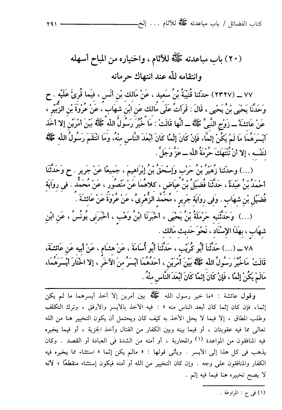 77 - (2327) حدّثنا قُتيْبَةُ بْنُ سَعِيدٍ، عَنْ مَالِكِ بْنِ أَنَسٍ، فِيَما قُرِئَ عَلَيْهِ. ح وَحَدَّثَنَا يَحْيَى بْنُ يَحْيَى، قَالَ: قَرَأتُ عَلَى مَالِكٍ عَنِ ابْنِ شِهَابٍ، عَنْ عُرْوَةَ بْنِ الزُّبَيْرِ، عَنْ عَائِشَةً - زَوْجِ النَّبِىِّ صَلَّى اللَّهُ عَلَيْهِ وَسَلَّمَ - أنَّها قَالَتْ: مَا خُيِّرَ رَسُولُ اللهِ صَلَّى اللَّهُ عَلَيْهِ وَسَلَّمَ بَيْنَ أمْرَيْنِ إلا أخَذ أَيْسَرَهُمَا مَا لَمْ يَكُنْ إثمًا، فَإنْ كَانَ إثْمًا كَانَ أبْعَدَ النَّاسِ مِنْهُ، وَمَا انْتَقَمَ رَسُولُ اللهِ صَلَّى اللَّهُ عَلَيْهِ وَسَلَّمَ لِنَفْسِهِ، إلا أَنْ تُنْتَهَكَ حُرْمَةُ اللهِ - عَزَّ وَجَلَّ.