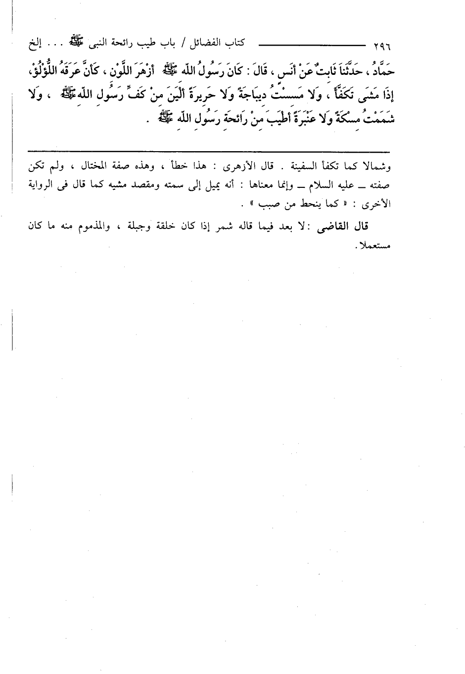 حَمَّادُ، حَدَّثَنَا ثَابِتٌ عَنْ أَنَسٍ، قَالَ: كَانَ رَسُولُ اللهِ صَلَّى اللَّهُ عَلَيْهِ وَسَلَّمَ أزْهَرَ اللَّوْنِ، كَأنَّ عَرَقَهُ اللُّؤْلُؤْ، إِذَا مَشَى تَكَفَّأَ، وَلا مَسِسْتُ دِيبَاجَةً وَلا حَرِيرَةً ألْيَنَ مِنْ كَفِّ رَسُولِ اللهِ صَلَّى اللَّهُ عَلَيْهِ وَسَلَّمَ، وَلا شَمَمْتُ مِسْكَةً وَلا عَنْبَرَةً أطْيَبَ مِنْ رَائحَةِ رَسُولِ اللهِ صَلَّى اللَّهُ عَلَيْهِ وَسَلَّمَ.