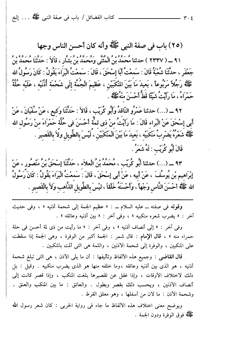 91 - (2337) حَدَّثَنَا مُحَمَّدُ بْنُ الْمُثَنَّى وَمُحَمَّدُ بْنُ بَشَّارٍ، قَالاَ: حَدَّثَنَا مُحَمَّدُ بْنُ جَعْفَر، حَدَّثَنَا شُعْبَةُ قَالَ: سَمِعْتُ أَبَا إِسْحَاقَ، قَالَ: سَمِعْتُ الْبَرَاءَ يَقُولُ: كَانَ رَسُولُ الله صَلَّى اللَّهُ عَلَيْهِ وَسَلَّمَ رَجُلاً مَرْبُوعاً، بَعِيدَ مَا بَيْنَ المنْكَبَيْنِ، عَظِيمَ الْجُمَّةِ إِلَى شَحْمَةِ أُذُنَيْهِ، عَلَيْهِ حُلَّةُ حَمْرَاءُ، مَا رَأَيْتُ شَيْئًا قَطُّ أَحْسَنَ مِنْهُ صَلَّى اللَّهُ عَلَيْهِ وَسَلَّمَ.