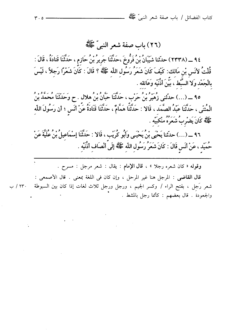 94 - (2338) حدّثنا شَيْبَانُ بْنُ فَرُّوخَ، حَدَّثَنَا جَرِيرُ بْنُ حَازِمٍ، حَدَّثَنَا قَتادَةُ، قَالَ: قُلْتُ لأَنَسِ بْنِ مَالِكٍ: كَيْفَ كَانَ شَعَرُ رَسُولِ اللهِ صَلَّى اللَّهُ عَلَيْهِ وَسَلَّمَ؟ قَالَ: كَانَ شَعْرًا رَجِلاً، لَيْسَ بِالْجَعْدِ وَلا السَّبِطِ، بَينَ أُذُنَيْهِ وَعَاتِقِهِ.