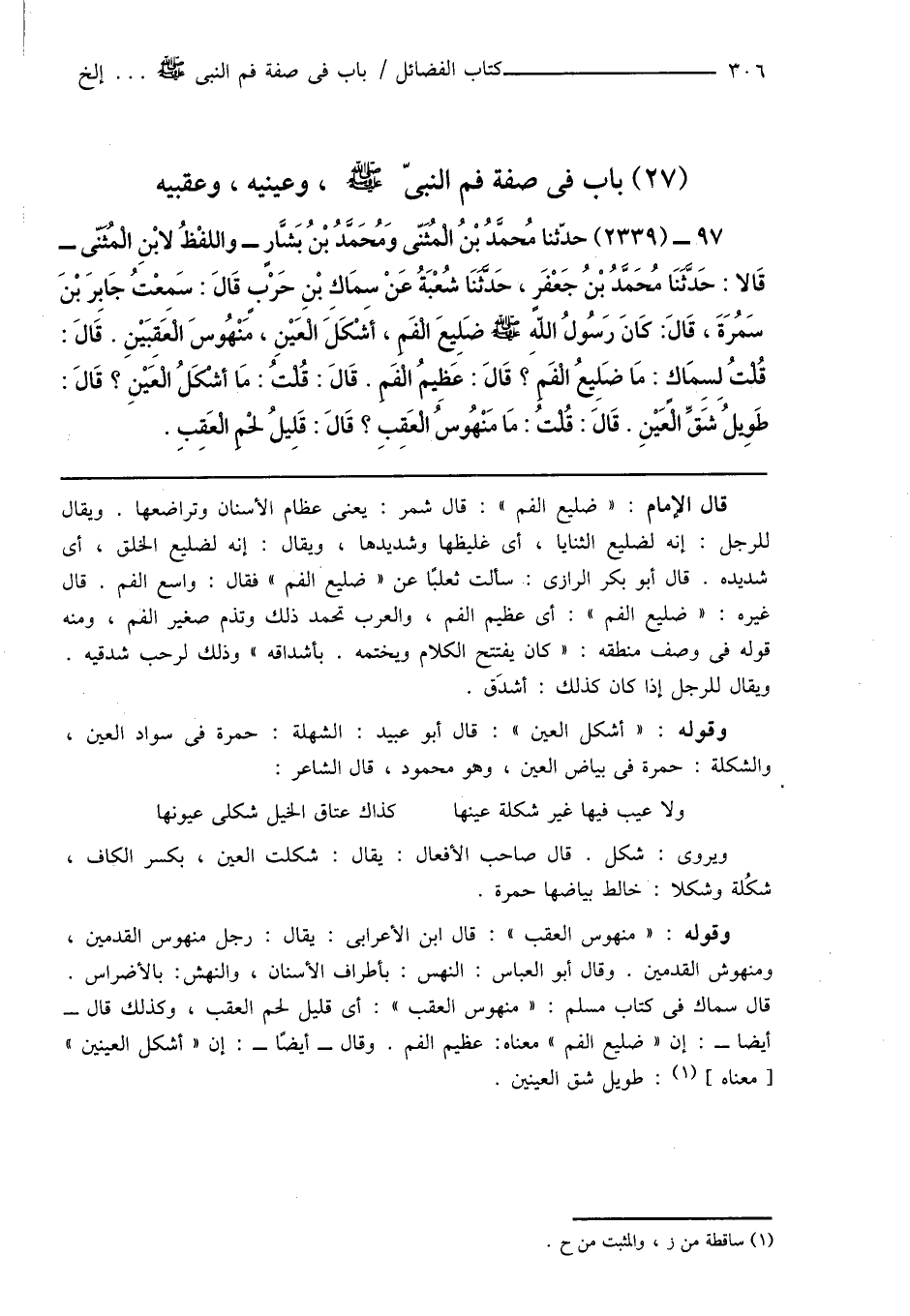 97 - (2339) حدّثنا مُحمَّدُ بْنُ الْمُثَنّى وَمُحَمَّدُ بْنُ بَشَّارٍ - واللفْظُ لابْنِ الْمُثَنّى - قَالا: حَدَّثَنَا مُحَمَّدُ بْنُ جَعْفَرٍ، حَدَّثَنَا شُعْبَةُ عَنْ سِمَاكِ بْنِ حَرْبٍ قَالَ: سَمِعْتُ جَابِرَ بْنَ سَمُرَةَ، قَالَ: كَانَ رَسُولُ اللهِ صَلَّى اللَّهُ عَلَيْهِ وَسَلَّمَ ضَلِيعَ الْفَمِ، أشْكَلَ الْعَيْنِ، مَنْهُوسَ الْعَقِبَيْنِ. قَالَ: قُلْتُ لِسِمَاكٍ: مَا ضَلِيعُ الْفَمِ؟ قَالَ: عَظِيمُ الْفَمِ. قَالَ: قُلْتُ: مَا أَشْكَلُ الْعَيْنِ؟ قَالَ: طَوِيلُ شَقِّ الْعَيْنِ. قَالَ: قُلْتُ: مَا مَنْهُوسُ الْعَقِبِ؟ قَالَ: قَلِيلُ لحْمِ الْعَقِبِ.
