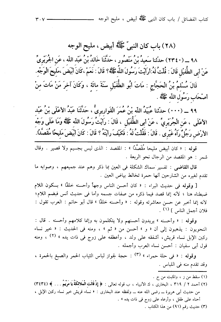 99 - (...) حدّثنا عُبَيْدُ اللهِ بْنُ عُمَرَ الْقَوارِيرِىُّ، حَدَّثَنَا عَبْدُ الأَعْلَى بْنُ عَبْدِ الأَعْلَى، عَنِ الْجُرَيْرِيِّ، عَنْ أَبِى الطُّفَيْلِ، قَالَ: رَأيْتُ رَسُولَ اللهِ صَلَّى اللَّهُ عَلَيْهِ وَسَلَّمَ وَمَا عَلَى وَجْهِ الأَرْضِ رَجُلٌ رَآهُ غَيْرِى. قَالَ: فَقُلْتُ لَهُ: فَكَيْفَ رأيْتَهُ؟ قَالَ: كَانَ أبْيَضَ مَلِيحًا مُقَصَّدًا.