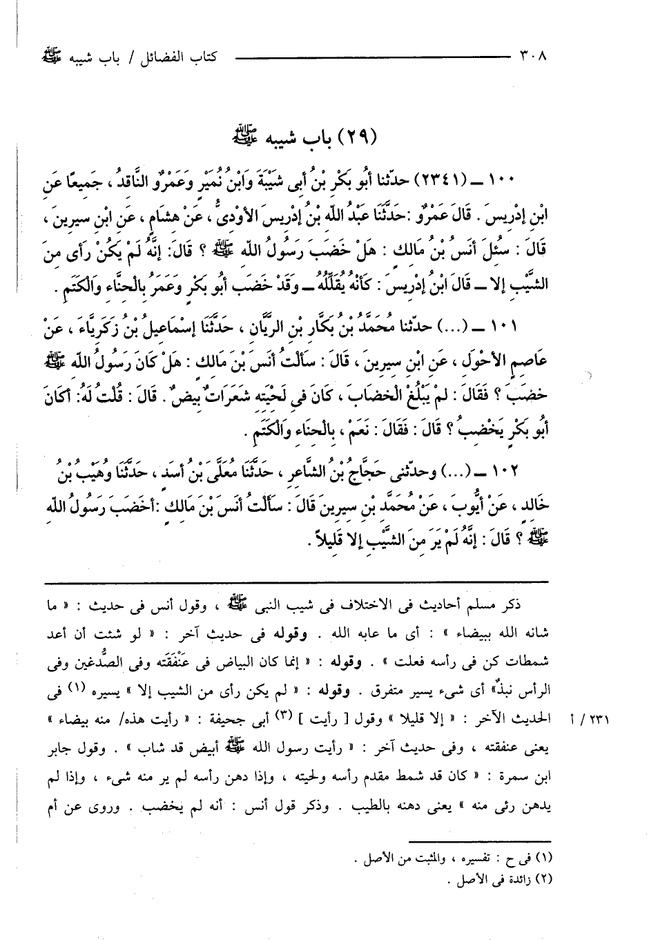 102 - (...) وحدّثنى حَجَّاجُ بْنُ الشَّاعِرِ، حَدَّثَنَا مُعَلَّىَ بْنُ أَسَدٍ، حَدَّثَنَا وُهَيْبُ بْنُ خَالِدٍ، عَنْ أيُّوبَ، عَنْ مُحَمَّدِ بْنِ سِيرِينَ قَالَ: سَألْتُ أنَسَ بْنَ مَالِكٍ: أخَضَبَ رَسُولُ اللهِ صَلَّى اللَّهُ عَلَيْهِ وَسَلَّمَ؟ قَالَ: إنَّهُ لَمْ يَرَ مِنَ الشَّيْبِ إلا قَلِيلاً.