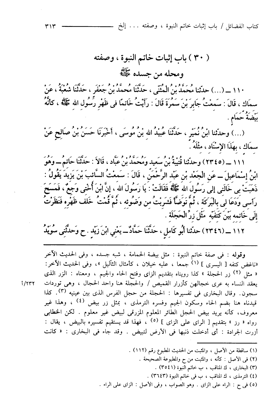 110 - (...) حدّثنا مُحَمَّدُ بْنُ الْمُثَنّى، حَدَّثَنَا مُحمَّدُ بْنُ جَعْفَرٍ، حَدَّثَنَا شُعْبَةُ، عَنْ سِمَاكٍ، قَالَ: سَمِعْتُ جَابِرَ بْنَ سَمُرَةَ قَالَ: رَأَيْتُ خَاتِمًا فى ظَهْرِ رَسُولِ اللهِ صَلَّى اللَّهُ عَلَيْهِ وَسَلَّمَ، كأنَّهُ بَيْضَةُ حَمَامٍ.