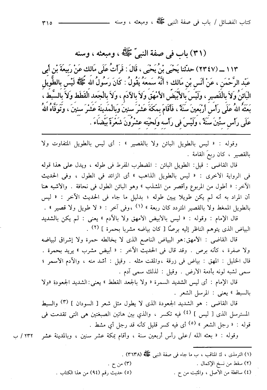113 - (2347) حدّثنا يَحْيَى بْنُ يَحْيَى، قَالَ: قَرَأتُ عَلَى مَالِكٍ عَنْ رَبِيعَةَ بْنِ أَبِى عَبْدِ الرَّحْمَنِ، عَنْ أَنَسِ بْنِ مَالِكٍ؛ أَنَّهُ سَمِعَهُ يَقُولُ: كَانَ رَسُولُ اللهِ صَلَّى اللَّهُ عَلَيْهِ وَسَلَّمَ لَيْسِ بالطَّوِيلِ الْبَائِنُ وَلاَ بِالْقَصِيرِ، وَلَيْسَ بِالأَبْيَضِ الأَمْهَقِ وَلاَ بِالآدَمِ، وَلاَ بِالْجَعِدِ الْقَطَطِ وَلاَ بِالسَّبطِ، بَعَثَهُ اللهُ عَلَى رَأسِ أَرْبَعِينَ سَنَةً، فَأَقَامَ بِمَكَةَ عَشْرَ سِنِينَ وَبِالْمَدِينَةِ عَشْرَ سِنِينَ، وَتَوَفَّاهُ اللهُ عَلَى رَأسِ سِتِّينَ سَنَةً، وَلَيْسَ فِى رَأسِهِ وَلِحْيَتِه عِشْرُونَ شَعْرَةً بَيْضَاءَ.