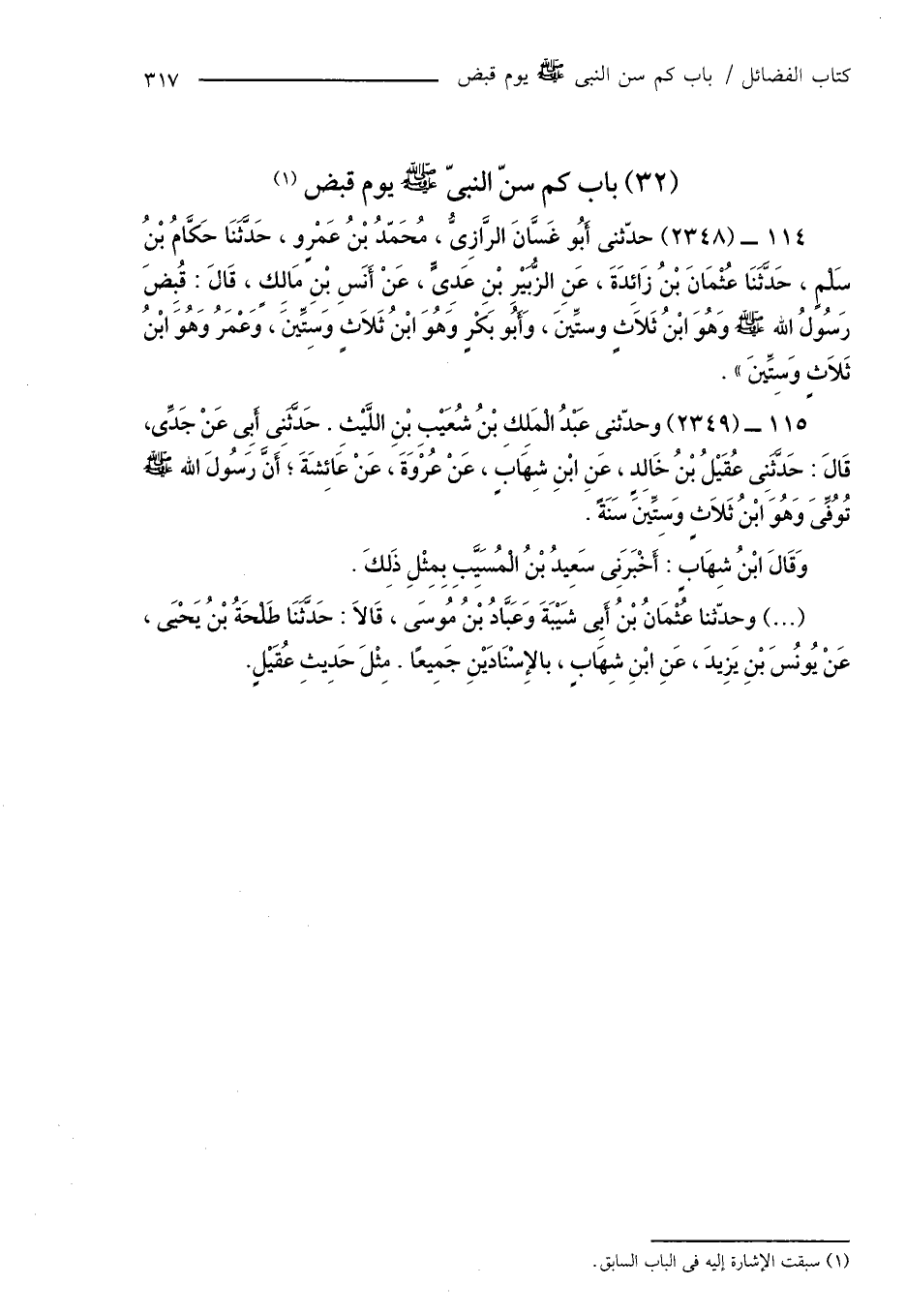 114 - (2348) حدّثنى أَبُو غَسَّانَ الرَّازِىُّ، مُحَمَّدُ بْنُ عَمْرٍو، حَدَّثَنَا حَكَّامُ بْنُ سَلْمٍ، حَدَّثَنَا عُثْمَانَ بْنُ زَائِدَةَ، عَنِ الزُّبَيْرِ بْنِ عَدِىٍّ، عَنْ أَنَسِ بْنِ مَالِكٍ، قَاقَ: قُبِضَ رَسُولُ الله صَلَّى اللَّهُ عَلَيْهِ وَسَلَّمَ وَهُوَ ابْنُ ثَلاثٍ وستِّينَ، وَأَبُو بَكْرٍ وَهُوَ ابْنُ ثَلاَثٍ وَسِتِّينَ، وَعُمَرُ وَهُوَ ابْنُ ثَلاَثٍ وَسِتِّينَ ".
