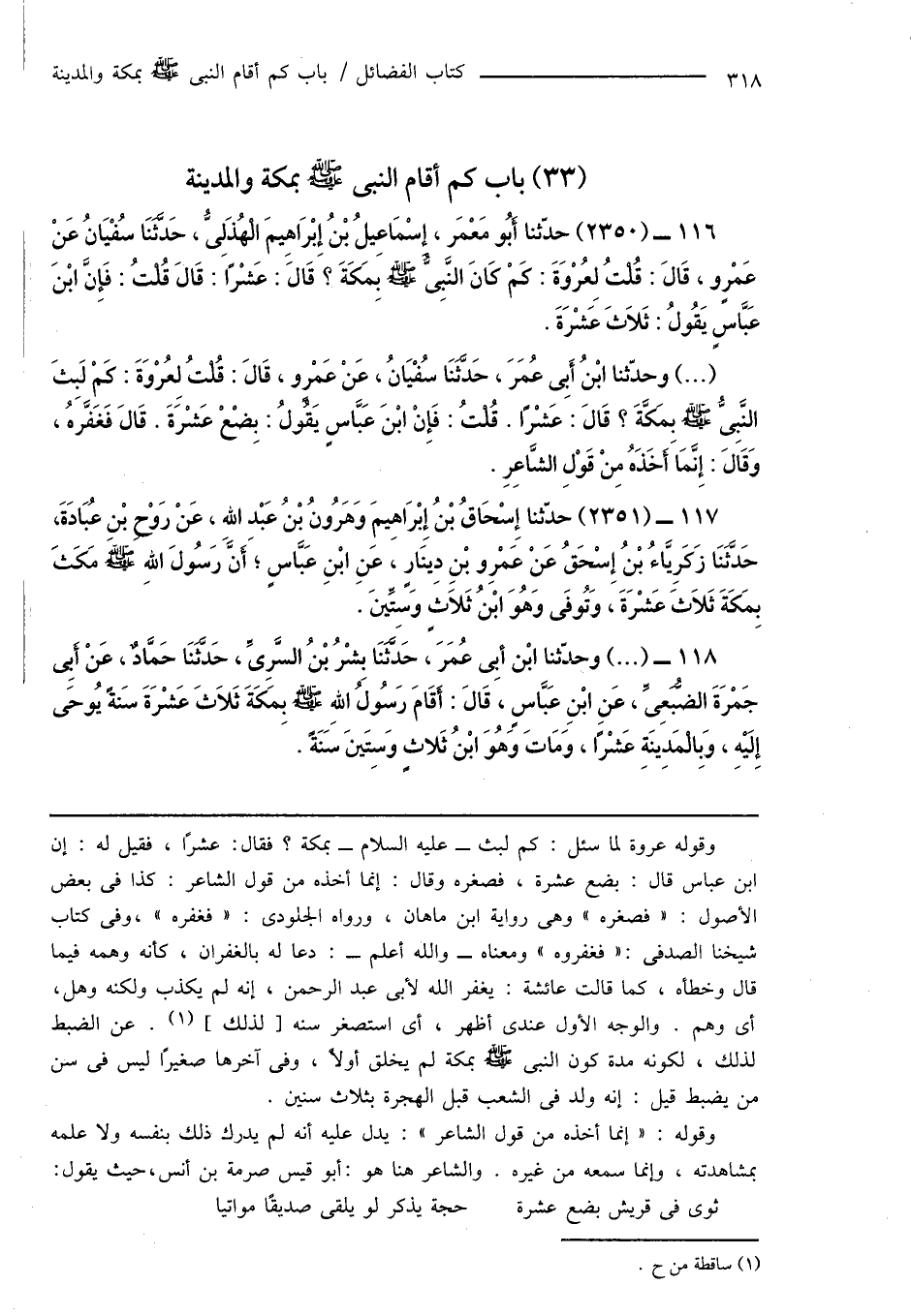 (...) وحدّثنا ابْنُ أَبِى عُمَرَ، حَدَّثَنَا سُفْيَانُ، عَنْ عَمْرٍو، قَالَ: قُلْتُ لِعُرْوَةَ: كَمْ لَبِثَ النَّبِىُّ صَلَّى اللَّهُ عَلَيْهِ وَسَلَّمَ بِمَكَّةَ؟ قَالَ: عَشْرًا. قُلْتُ: فَإِنْ ابْنَ عَبَّاسٍ يَقُولُ: بِضْع عَشْرَةَ. قَالَ فَغَفَّرهُ، وَقَالَ: إِنَّمَا أَخَذَهُ مِنْ قَوْلِ الشَّاعِرِ.