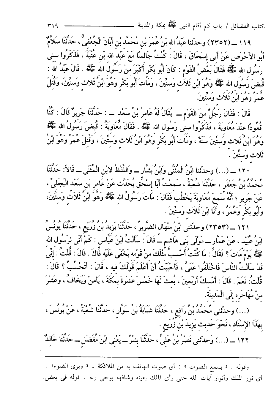 119 - (2352) وحدّثنا عَبْدُ اللهِ بْنُ عُمَرَ بْنِ مُحَمَّدِ بْنِ أَبَانَ الْجُعْفِىُّ، حَدَّثَنَا سَلاَّمٌ أَبُو الأَحْوَصِ عَنْ أَبِى إِسْحَاقَ، قَالَ: كُنْتُ جَالِسًا مَعَ عَبْدِ اللهِ بْنِ عُتْبَةَ، فَذَكَرُوا سِنِى رَسُولِ اللهِ صَلَّى اللَّهُ عَلَيْهِ وَسَلَّمَ فَقَالَ بَعْضُ الْقَوْمِ: كَانَ أَبُو بَكْرٍ أَكْبَرَ مِنْ رَسُولَ اللهِ صَلَّى اللَّهُ عَلَيْهِ وَسَلَّمَ. قَالَ عَبْدُ اللهِ: قُبِضَ رَسُولِ اللهِ صَلَّى اللَّهُ عَلَيْهِ وَسَلَّمَ وَهُوَ ابْن ثَلاَثٍ وَسِتِّينَ، وَمَاتَ أَبُو بَكْرٍ وَهُوَ ابْن ثَلاثٍ وَسِتِّينَ، وَقُتِلَ عُمَرُ وَهُوَ ابْنُ ثَلاَثٍ وَسِّتينَ.