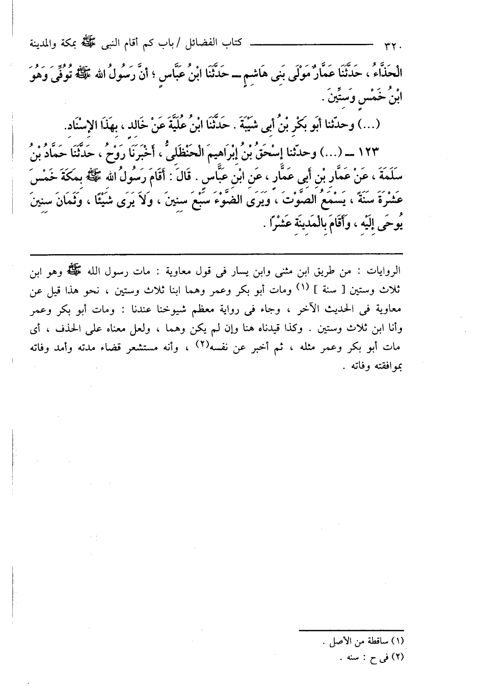123 - (...) وحدّثنا إسْحَاقُ بْنُ إِبْرَاهِيمَ الْحَنْظَلِىُّ، أَخْبَرَنَا رَوْحُ، حَدَّثَنَا حَمَّادُ بْنُ سَلَمَةَ، عَنْ عَمَّارِ بْنِ أَبِى عَمَّارٍ، عَنِ ابْنِ عَبَّاسٍ. قَالَ: أَقَامَ رَسُولُ اللهِ صَلَّى اللَّهُ عَلَيْهِ وَسَلَّمَ بِمَكَّةَ خَمْسَ عَشْرَةَ سَنَةً، يَسْمَعُ الصَّوْتَ، وَيَرَى الضَّوْءَ سَبْعِ سِنِينَ، وَلاَ يَرَى شَيْئًا، وَثَمَانَ سِنِينَ يُوحَى إِلَيْهِ، وَأقَامَ بِالْمَدِينَةِ عَشْرًا.