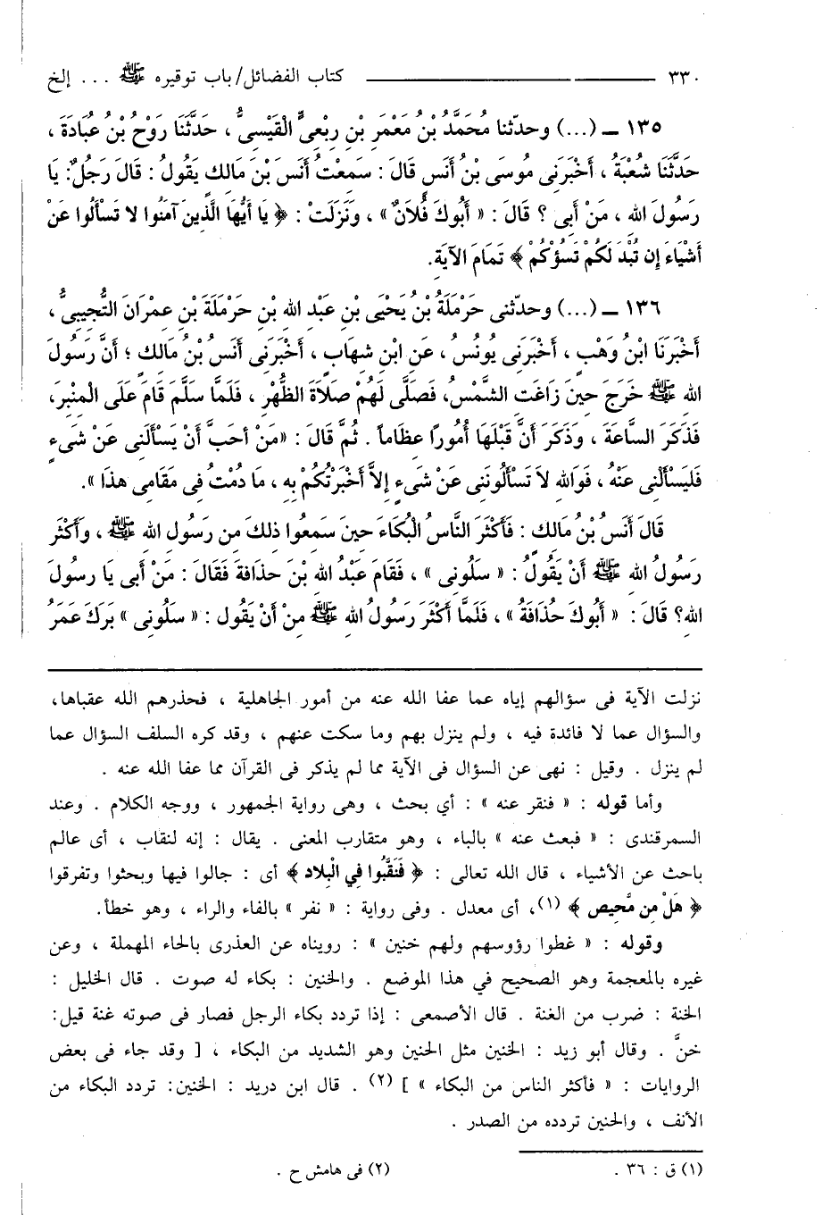 135 - (...) وحدّثنا مُحَمَّدُ بْنُ مَعْمَرِ بْنِ رِبْعِىٍّ الْقَيْسِىُّ، حَدَّثَنَا رَوْحُ بْنُ عُبَادَةَ، حَدَّثَنَا شُعْبَةُ، أَخْبَرَنِى مُوسَى بْنُ أَنَسٍ قَالَ: سَمِعْتُ أَنَسَ بْنَ مَالِكٍ يَقُولُ: قَالَ رَجُلٌ: يَا رَسُولَ اللهِ، مَنْ أَبِى؟ قَالَ: " أَبُوكَ فُلاَنٌ "، وَنَزَلَتْ: {يَا أَيُّهَا الَّذِينَ آمَنُوا لا تَسْأَلُوا عَنْ أَشْيَاءَ إِن تُبْدَ لَكُمْ تَسُؤْكُمْ} تَمَامَ الآيَةِ.