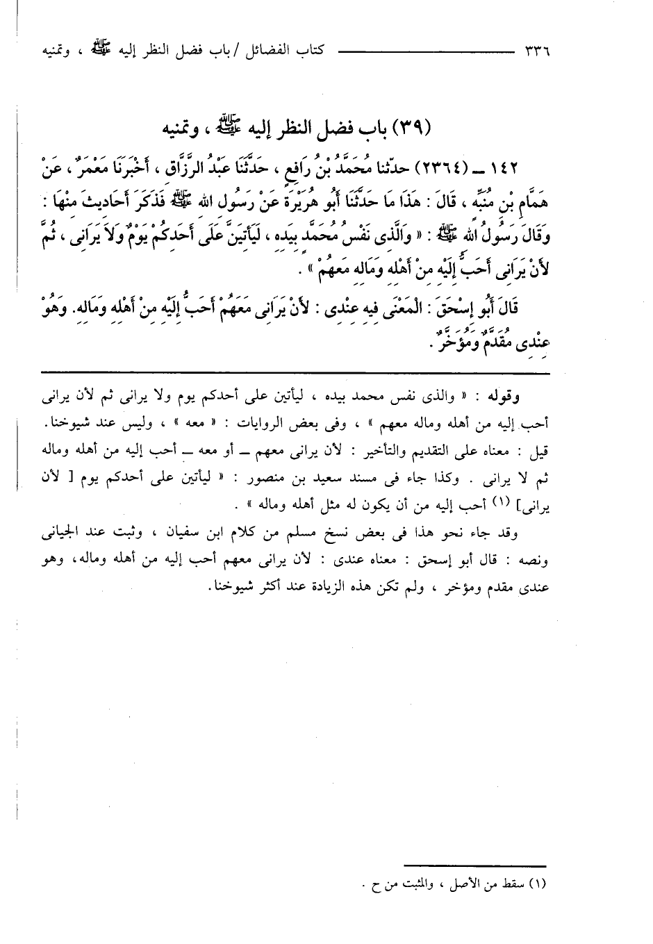 142 - (2364) حدّثنا مُحَمَّدُ بْنُ رَافِعٍ، حَدَّثَنَا عَبْدُ الرَّزَّاقِ، أَخْبَرَنَا مَعْمَرٌ، عَنْ هَمَّامِ بْنِ مُنَبِّهٍ، قَالَ: هَذَا مَا حَدَّثَنَا أَبُو هُرَيْرَة عَنْ رَسُولِ اللهِ صَلَّى اللَّهُ عَلَيْهِ وَسَلَّمَ فَذَكَرَ أَحَادِيثَ مِنْهَا: وَقَالَ رَسُولُ اللهِ صَلَّى اللَّهُ عَلَيْهِ وَسَلَّمَ: " وَالَّذِى نَفْسُ مُحَمَّدٍ بِيَدِهِ، لَيَأتِيَنَّ عَلَى أَحَدِكُمْ يَوْمٌ وَلاَ يَرَانِى، ثُمَّ لأَنْ يَرَانِى أَحَبُّ إِلَيْهِ مِنْ أَهْلِهِ وَمَالِهِ مَعهُمْ ".