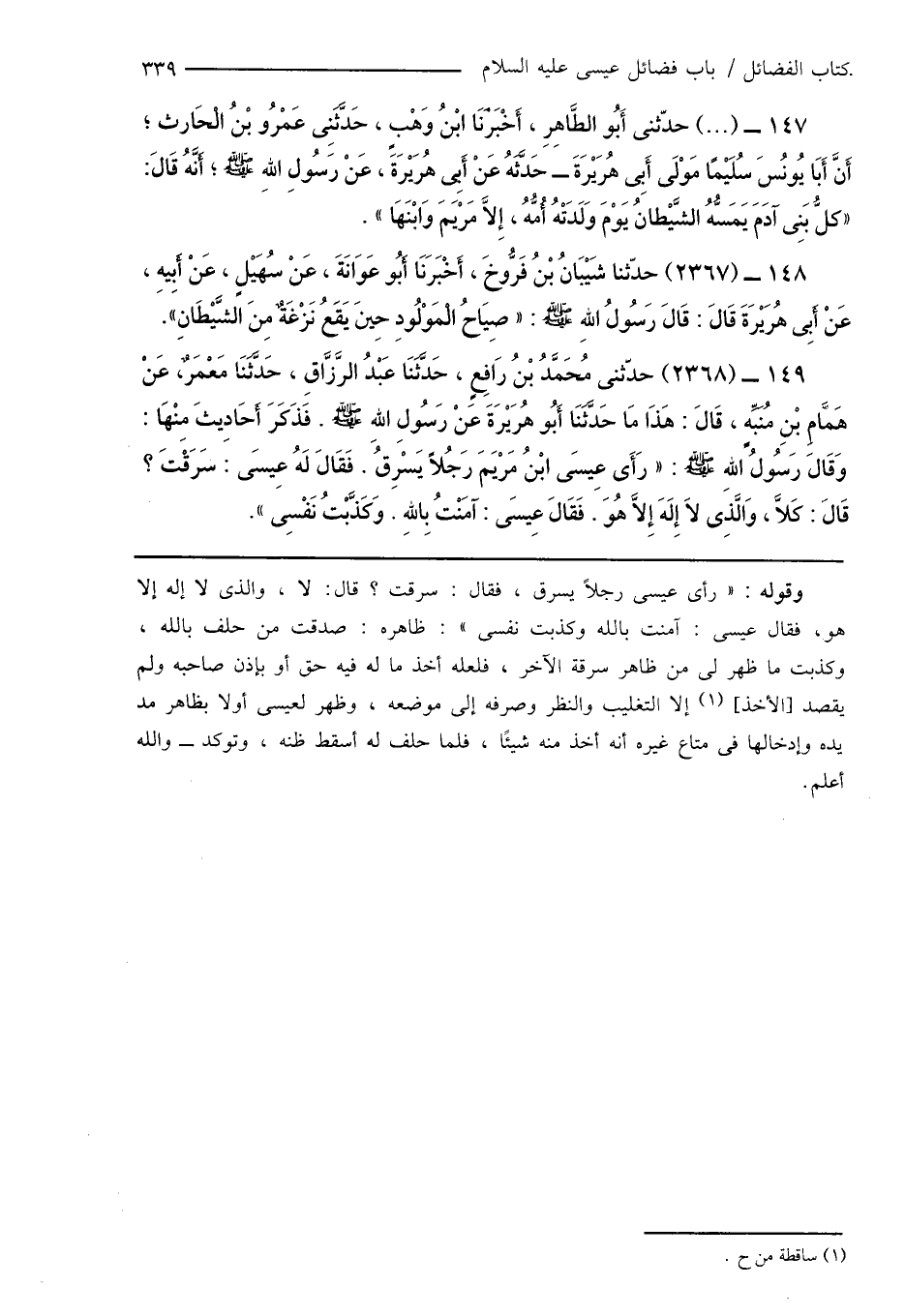 147 - (...) حدّثنى أَبُو الطَّاهِرِ، أَخْبَرَنَا ابْنُ وَهْبٍ، حَدَّثَنِى عَمْرُو بْنُ الْحَارِثِ؛ أَنَّ أَبَا يُونُسَ سُلَيْمًا مَوْلَى أَبِى هُرَيْرَةَ - حَدَّثَهُ عَنْ أَبِى هُرَيْرَةَ، عَنْ رَسُولِ اللهِ صَلَّى اللَّهُ عَلَيْهِ وَسَلَّمَ، أَنَّهُ قَالَ: " كلُّ بَنِى آدَمَ يَمَسُّهُ الشَّيْطانُ يَوْمَ وَلَدَتْهُ أُمُّهُ، إِلاَّ مَرْيَمَ وَابْنَهَا ".