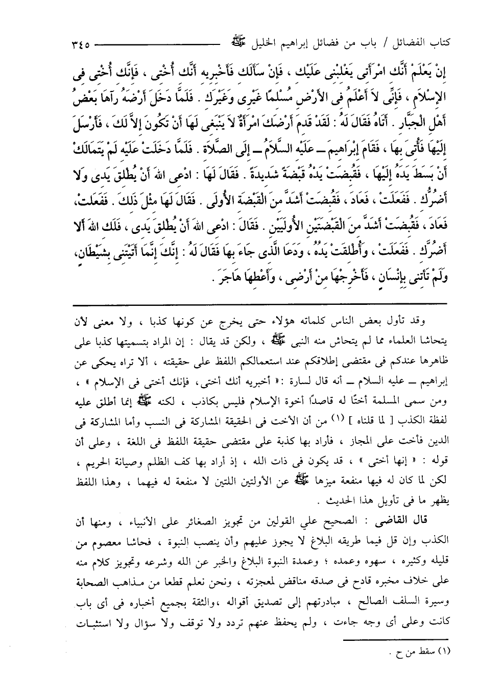 قال القاضى: الصحيح على القولين من تجويز الصغائر على الأنبياء، ومنها أن الكذب وإن قل فيما طريقه البلاغ لا يجوز عليهم وأن ينصب النبوة، فحاشا معصوم من قليله وكثيره، سهوه وعمده؛ وعمدة النبوة البلاغ والخبر عن الله وشرعه وتجويز كلام منه على خلاف مخبره قادح فى صدقه مناقض لمعجزته، ونحن نعلم قطعاً من مذاهب الصحابة وسيرة السنف الصالح، مبادرتهم إلى تصديق أقواله، والثقة بجميع أخباره فى أى باب كانت وعلى أى وجه جاءت، ولم يحفظ عنهم تردد ولا توقف ولا سؤال ولا استثبات