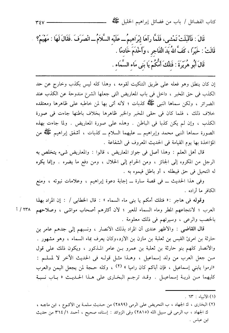 وقوله فى هاجر: " فتلك أمكم يا بنى ماء السماء ": قال الخطابى: إن المراد بهذا العرب؛ لانتجاعهم المطر وماء السماء للعير؛ لأن أكثرهم أصحاب مواشى، وصلاحهم بالخصب والرعى، وسيرتهم فى ذلك معلومة.