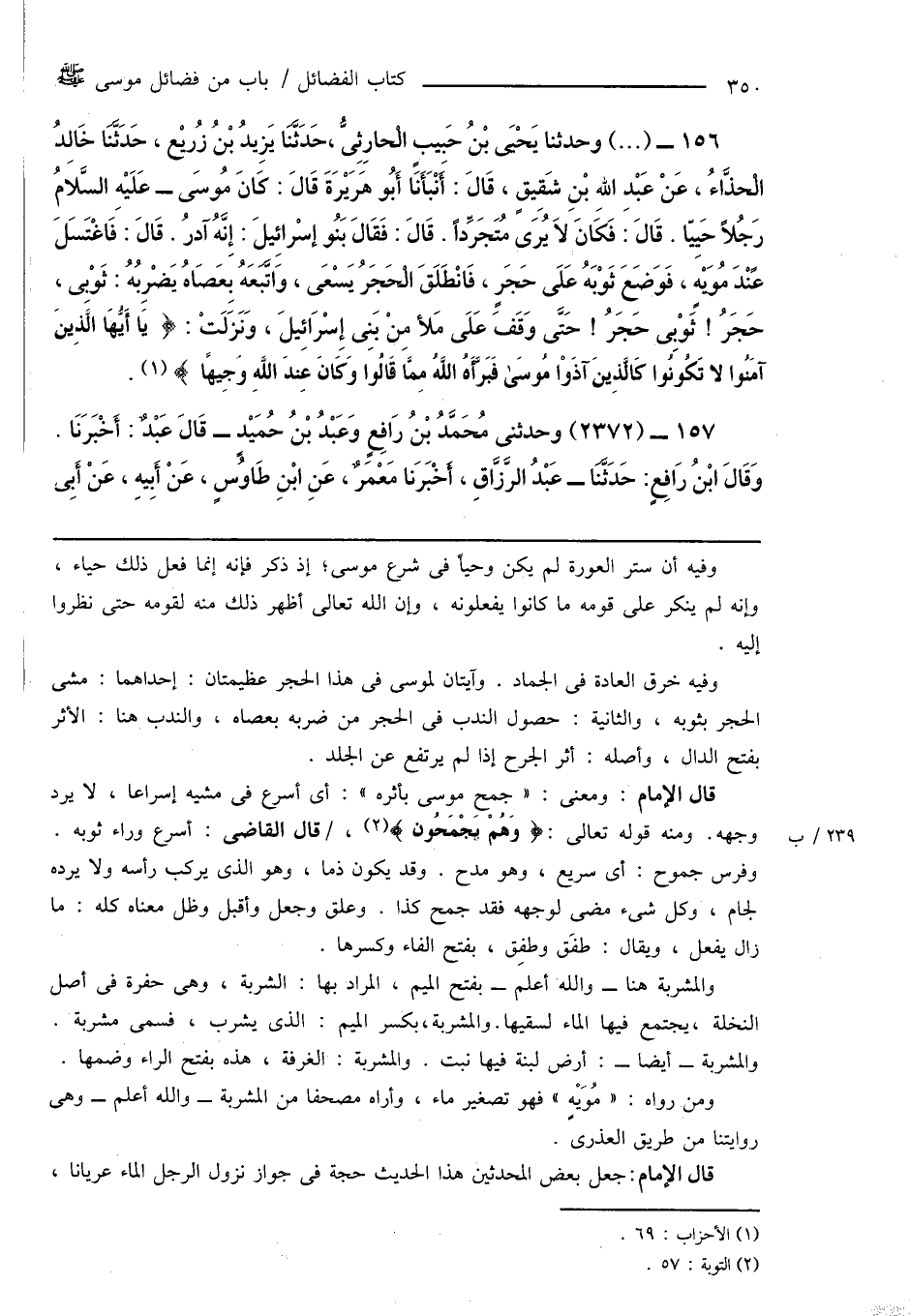 156 - (...) وحدثنا يَحْيَى بْنُ حَبِيبٍ الْحَارِثِىُّ، حَدَثَّنَا يَزِيدُ بْنُ زُرَيْع، حَدَثَّنَا خَالِدُ الْحَذَّاءُ، عَنْ عَبْدِ اللهِ بْنِ شَقِيقٍ، قَالَ: أَنْبَأَنَا أَبُو هَرَيْرَةَ قَالَ: كَانَ مُوسَى - عَلَيْهِ السَّلاَمُ رَجُلاً حَيِيًّا. قَالَ: فَكَانَ لاَ يُرَى مُتَجَرِّداً. قَالَ: فَقَالَ بَنُو إسْرَائِيلَ: إِنَّهُ آدرُ. قَالَ: فَاغْتَسَلَ عَنْدَ مُوَيْهٍ، فَوَضَعَ ثَوْبَهُ عَلَى حَجَرٍ، فَانْطَلَقَ الْحَجَرُ يَسْعَى، وَاتَّبَعَهُ بِعَصَاهُ يَضْرِبُهُ: ثَوْبِى، حَجَرُ! ثَوْبِى حَجَرُ! حَتَّى وَقَفَ عَلَى مَلأ مِنْ بَنِى إِسْرَائِيلَ، وَنَزَلَتْ: {يَا أَيُّهَا الَّذِينَ آمَنُوا لا تَكُونُوا كَالَّذِينَ آذَوْا مُوسَى فَبَرَّأَهُ اللَّهُ مِمَّا قَالُوا وَكَانَ عِندَ اللَّهِ وَجِيهًا} (¬1).