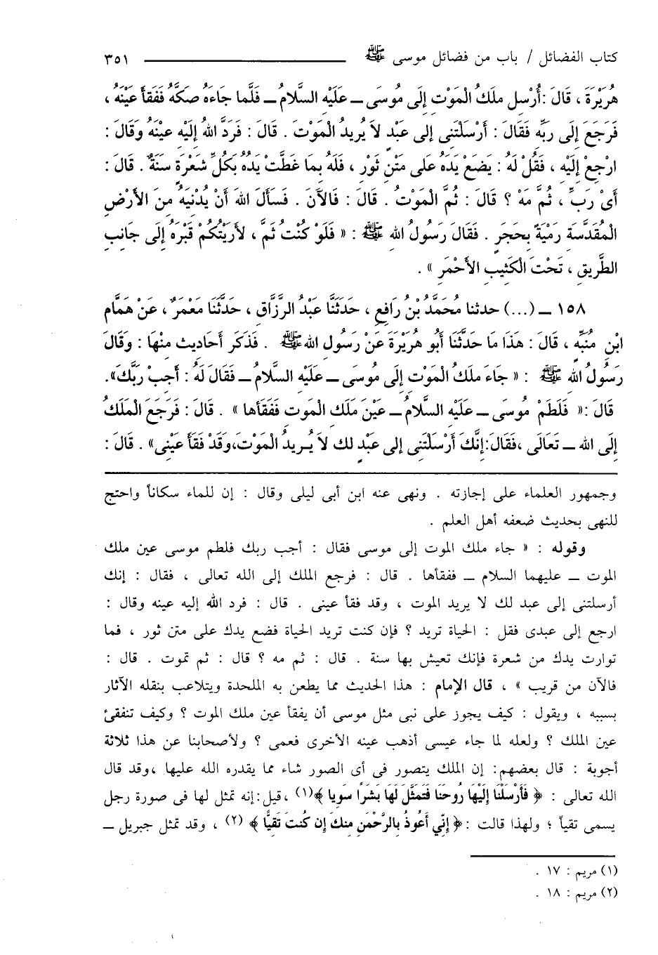 158 - (...) حدثنا مُحَمَّدُ بْنُ رَافِعٍ، حَدَّثَنَا عَبْدُ الرَّزَّاقِ، حَدَّثَنَا مَعْمَرٌ، عَنْ هَمَّامِ ابْنِ مُنَبِّهٍ، قَالَ: هَذَا مَا حَدَّثَنَا أَبُو هُرَيْرَةَ عَنْ رَسُولِ اللهِ صَلَّى اللَّهُ عَلَيْهِ وَسَلَّمَ. فَذَكَر أَحَادِيث مِنْهَا: وَقَالَ رَسُولُ اللهِ صَلَّى اللَّهُ عَلَيْهِ وَسَلَّمَ: " جَاءَ ملَكُ الْمَوْتِ إِلَى مُوسَى - عَلَيْه السَّلامُ - فَقَالَ لَهُ: أَجِبْ رَبَّكَ ". قَالَ: " فَلَطَمْ مُوسَى - عَلَيْه السَّلامُ - عَيْنَ مَلَكِ الْمَوَتِ فَفَقَأها ". قَالَ: فَرَجَعَ الْمَلَكُ إِلَى الله - تَعَالَى، فَقَالَ: إِنَّكَ أَرْسَلْتَنِى إلى عَبْدٍ لك لاَ يُريدُ الْمَوْتَ، وَقَدْ فَقَأَ عَيْنِى". قَالَ: