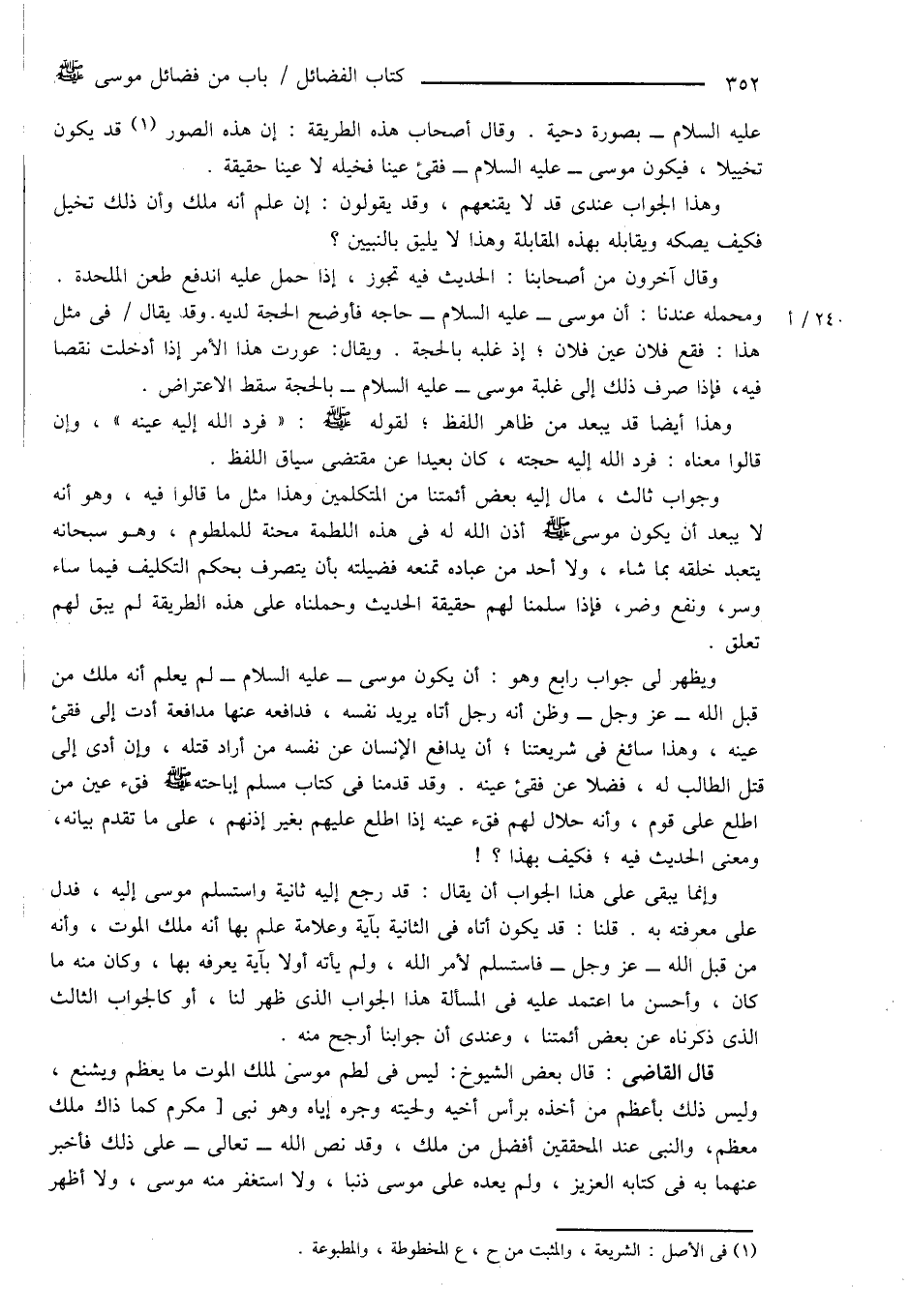 وإنما يبقى على هذا الجواب أن يقال: قد رجع إليه ثانية واستسلم موسى إليه، فدل على معرفته به. قلنا: قد يكون أتاه فى الثانية بآية وعلامة علم بها أنه ملك الموت، وأنه من قبل الله - عز وجل - فاستسلم لأمر الله، ولم يأته أولاً بآية يعرفه بها، وكان منه ما كان، وأحسن ما اعتمد عليه فى المسألة هذا الجواب الذى ظهر لنا، أو كالجواب الثالث الذى ذكرناه عن بعض أئمتنا، وعندى أن جوابنا أرجح منه.