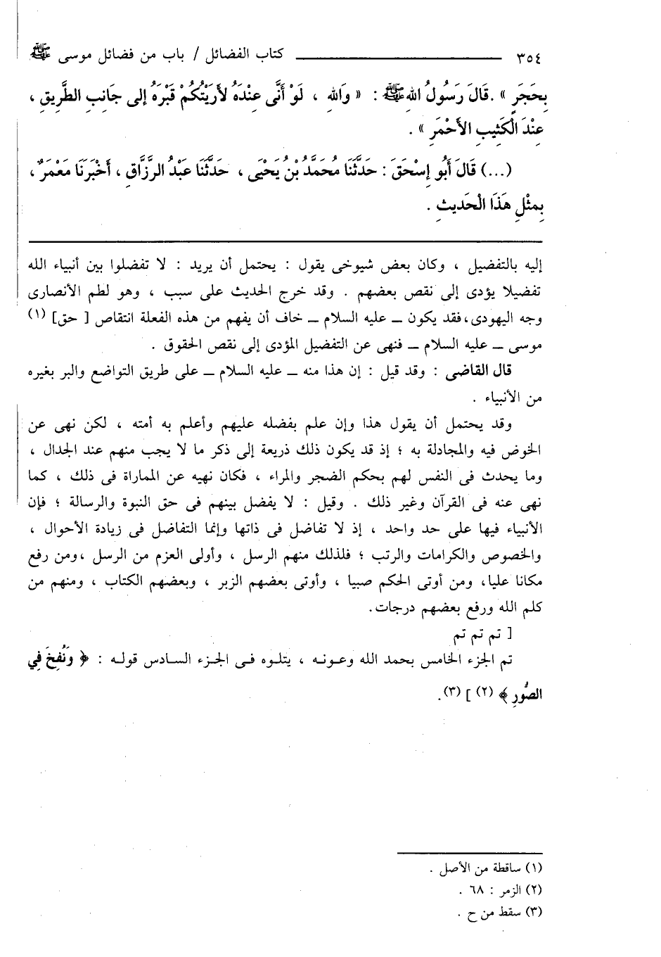 وقد يحتمل أن يقول هذا وإن علم بفضله عليهم وأعلم به أمته، لكن نهى عن الخوض فيه والمجادلة به؛ إذ قد يكون ذلك ذريعة إلى ذكر ما لا يجب منهم عند الجدال، وما يحدث فى النفس لهم بحكم الضجر والمراء، فكان نهيه عن المماراة فى ذلك، كما نهى عنه فى القرآن وغير ذلك. وقيل: لا يفضل بينهم فى حق النبوة والرسالة؛ فإن الأنبياء فيها على حد واحد، إذ لا تفاضل فى ذاتها وإنما التفاضل فى زيادة الأحوال، والخصوص والكرامات والرتب؛ فلذلك منهم الرسل، وأولى العزم من الرسل، ومن رفع مكاناً علياً، ومن أوتى الحكم صبياً، وأوتى بعضهم الزبر، وبعضهم الكتاب، ومنهم من كلم الله ورفع بعضهم درجات.