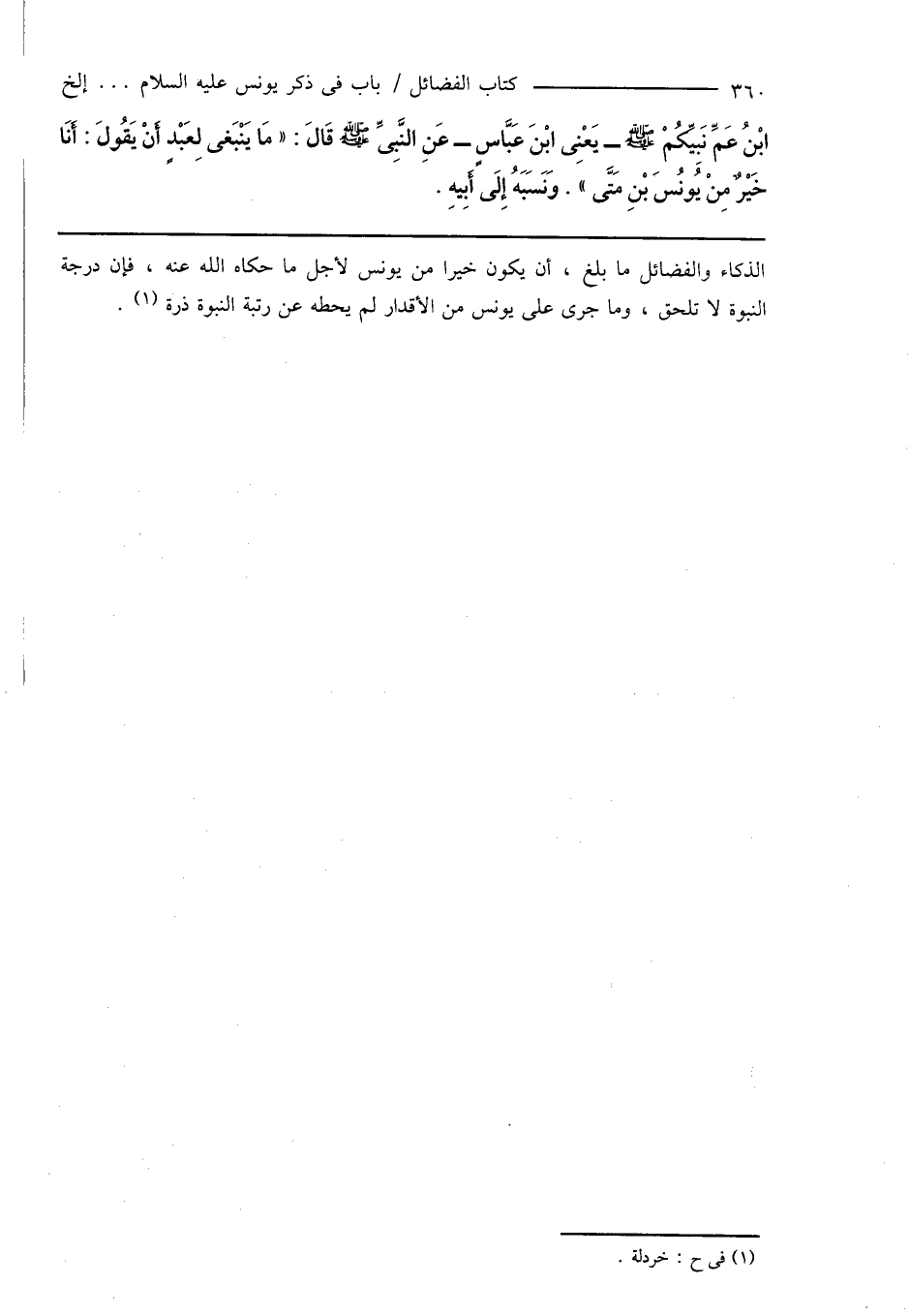 الذكاء والفضائل ما بلغ، أن يكون خيراً من يونس لأجل ما حكاه الله عنه، فإن درجة النبوة لا تلحق، وما جرى على يونس من الأقدار لم يحطه عن رتبة النبوة ذرة (¬1).