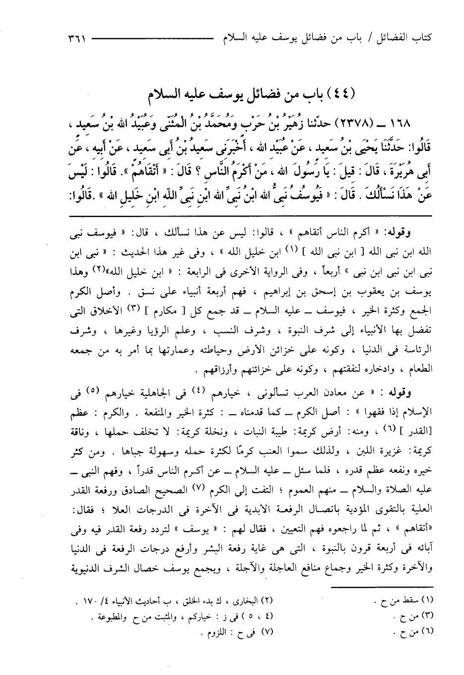 168 - (2378) حدّثنا زُهَيْرُ بْنُ حَرْبٍ وَمُحَمَّدُ بْنُ الْمُثَنّى وَعُبَيْدُ الله بْنُ سَعِيدٍ، قَالُوا: حَدَّثَنَا يَحْيَى بْنُ سَعِيدٍ، عَنْ عُبَيْدِ الله، أَخْبَرَنِى سَعِيدُ بْنُ أَبِى سَعِيدٍ، عَنْ أَبِيهِ، عَنِ أَبِى هُرَيْرَةَ، قَالَ: قِيلَ: يَا رَسُولَ الله، مَنْ أَكْرَمُ النَّاسِ؟ قَالَ: " أَتْقَاهُمْ ". قَالُوا: لَيْسَ عَنْ هَذَا نَسْأَلُكَ. قَالَ: " فَيُوسُفُ نَبِىُّ الله ابْنُ نَبِىِّ الله ابْنِ نَبِىِّ اللهِ ابْنِ خَلِيلِ الله ". قَالُوا: