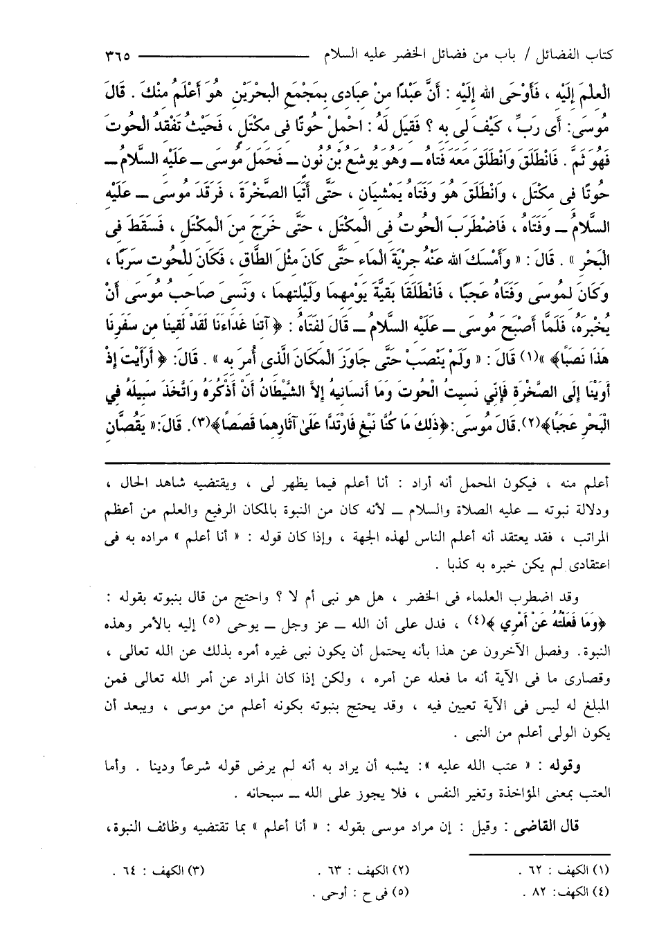وقد اضطرب العلماء فى الخضر، هل هو نبى أم لا؟ واحتج من قال بنبوته بقوله: {وَمَا فَعَلْتُهُ عَنْ أَمْرِي} (¬4)، فدل على أن الله - عز وجل - يوحى (¬5) إليه بالأمر وهذه النبوة. وفصل الآخرون عن هذا بانه يحتمل أن يكون نبى غيره أمره بذلك عن الله تعالى، وقصارى ما فى الآية أنه ما فعله عن أمره، ولكن إذا كان المراد عن أمر الله تعالى فمن المبلغ له ليس فى الآية تعيين فيه، وقد يحتج بنبوته بكونه أعلم من موسى، ويبعد أن يكون الولى أعلم من النبى.