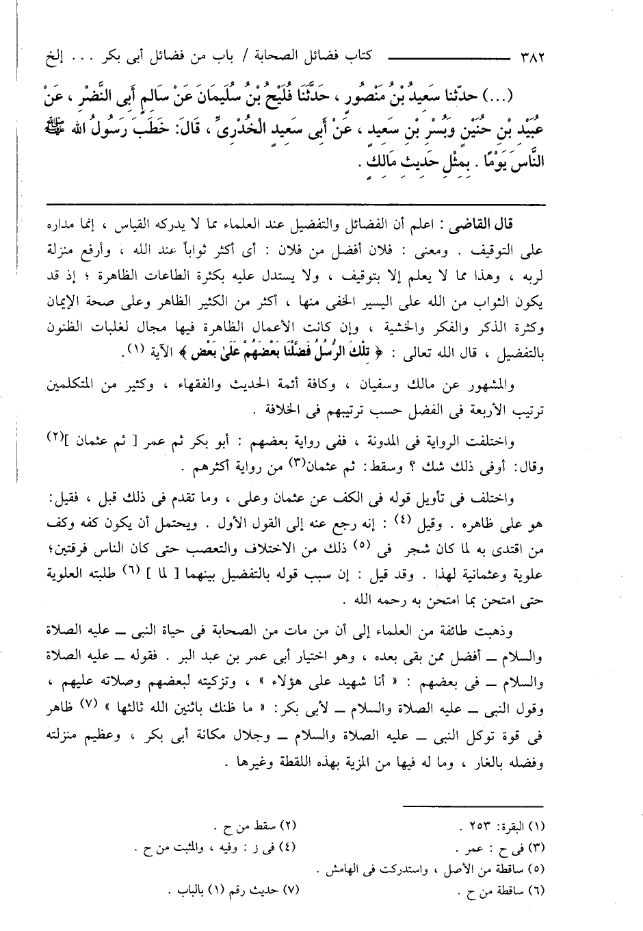 قال القاضى: اعلم أن الفضائل والتفضيل عند العلماء مما لا يدركه القياس، إنما مداره على التوقيف. ومعنى: فلان أفضل من فلان: أى أكثر ثواباً عند الله، وأرفع منزلة لربه، وهذا مما لا يعلم إلا بتوقيف، ولا يستدل عليه بكثرة الطاعات الظاهرة؛ إذ قد يكون الثواب من الله على اليسير الخفى منها، أكثر من الكثير الظاهر وعلى صحة الإيمان وكثرة الذكر والفكر والخشية، وإن كانت الأعمال الظاهرة فيها مجال لغلبات الظنون بالتفضيل، قال الله تعالى: {تِلْكَ الرُّسُلُ فَضَّلْنَا بَعْضَهُمْ عَلَى بَعْض} الآية (¬1).