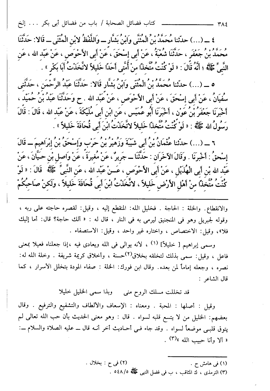 6 - (...) حدّثنا عُثْمَانُ بْنُ أَبِى شَيْبَةَ وَزُهَيْرُ بْنُ حَرْبٍ وَإِسْحَاقُ بْنُ إِبْرَاهِيمَ - قَالَ إِسْحَاقُ: أَخْبَرَنَا. وَقَالَ الآخَرَانِ: حَدَّثَنَا - جَرِيرٌ، عَنْ مُغِيرَةَ، عَنْ وَاصِلِ بْنِ حَيَّانَ، عَنْ عَبْدِ اللهِ بْنِ أَبِى الْهُذَيْلِ، عَنْ أَبِى الأَحْوَصِ، عَنْ عَبْدِ اللهِ، عَنِ النَّبِىِّ صَلَّى اللَّهُ عَلَيْهِ وَسَلَّمَ قَالَ: " لَوْ كُنْتُ مُتَّخِذًا مِنْ أَهْلِ الأَرْضِ خَلِيلاً، لاتَّخَذْتُ ابْنَ أَبِى قُحَافَةَ خَلِيلاً، وَلَكِنْ صَاحِبُكُمْ
