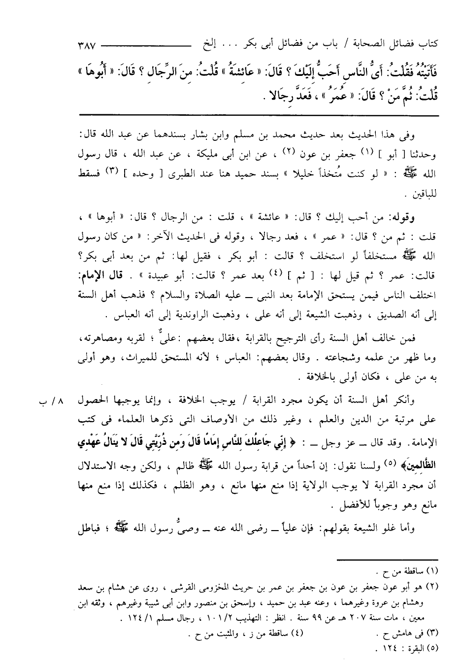 وأنكر أهل السنة أن يكون مجرد القرابة يوجب الخلافة، وإنما يوجبها الحصول على مرتبة من الدين والعلم، وغير ذلك من الأوصاف التى ذكرها العلماء فى كتب الإمامة. وقد قال - عز وجل -: {إِنِّي جَاعِلُكَ لِلنَّاسِ أِمَامًا قَالَ وَمِن ذُرِّيَّتِي قَالَ لا يَنَالُ عَهْدِي الظَّالِمِينَ} (¬5) ولسنا نقول: إن أحدًا من قرابة رسول الله صَلَّى اللَّهُ عَلَيْهِ وَسَلَّمَ ظالم، ولكن وجه الاستدلال أن مجرد القرابة لا يوجب الولاية إذا منع منها مانع، وهو الظلم، فكذلك إذا منع منها مانع وهو وجوباً للأفضل.