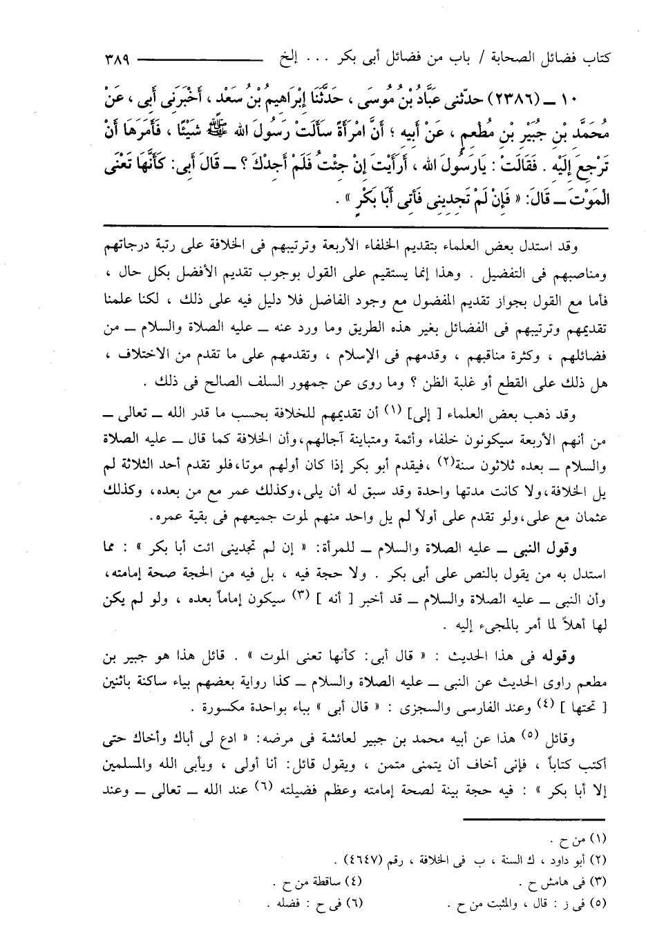 10 - (2386) حدّثنى عَبَّادُ بْنُ مُوسَى، حَدَّثَنَا إِبْرَاهِيمُ بْنُ سَعْدٍ، أَخْبَرَنِى أَبِى، عَنْ مُحَمَّدِ بْنِ جُبَيْرِ بْنِ مُطْعِمٍ، عَنْ أَبِيهِ؛ أَنَّ امْرَأَةً سَأَلَتْ رَسُولَ اللهِ صَلَّى اللَّهُ عَلَيْهِ وَسَلَّمَ شَيْئًا، فَأَمَرَهَا أَنْ تَرْجِعَ إِلَيْهِ. فَقَالَتْ: يَا رَسُولَ اللهِ، أَرَأَيْتَ إِنْ جِئْتُ فَلَمْ أَجِدْكَ؟ - قَالَ أَبِى: كَأَنَّهَا تَعْنَى الْمَوْتَ - قَالَ: " فَإِنْ لَمْ تَجِدِينِى فَأتِى أَبَا بَكْرٍ ".