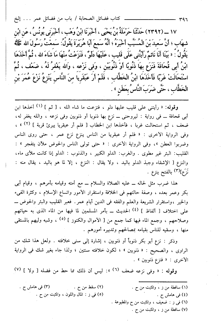 17 - (2392) حَدّثَنَا حَرْمَلَةُ بْنُ يَحْيَى، أَخْبَرَنَا ابْنُ وَهْبٍ، أَخْبَرَنِى يُونُسُ، عَنِ ابْنِ شِهَابٍ؛ أَنَّ سَعِيدَ بْنَ الْمُسَيَّبِ أَخْبَرَهُ؛ أَنَّهُ سَمِعَ أَبَا هُرَيْرَةَ يَقُولُ: سَمِعْتُ رَسُولَ اللهِ صَلَّى اللَّهُ عَلَيْهِ وَسَلَّمَ يَقُولُ: " بَيْنَا أَنَا نَائِمٌ رَأَيْتُنِى عَلَى قَلِيبٍ، عَلَيْهَا دَلْوٌ، فَنَزَعْتُ مِنْهَا مَا شَاءَ الله، ثُمَّ أَخَذَهَا ابْنُ أَبِى قُحَافَةَ فَنَزَعَ بِهَا ذَنُوبًا أَوْ ذَنُوبَيْنِ، وَفِى نَزْعِهِ، وَالله يَغْفِرُ لَهُ، ضَعْف، ثُمَّ اسْتَحَالَتْ غَرْبًا فَأَخَذَهَا ابْنُ الْخَطَّابِ، فَلَمْ أَرَ عَبْقَرِيًّا مِنَ النَّاسِ يَنْزِعُ نَزْعَ عُمَرَ بْنِ الْخَطَّابِ، حَتَّى ضَرَبَ النَّاسُ بِعَطَنٍ ".