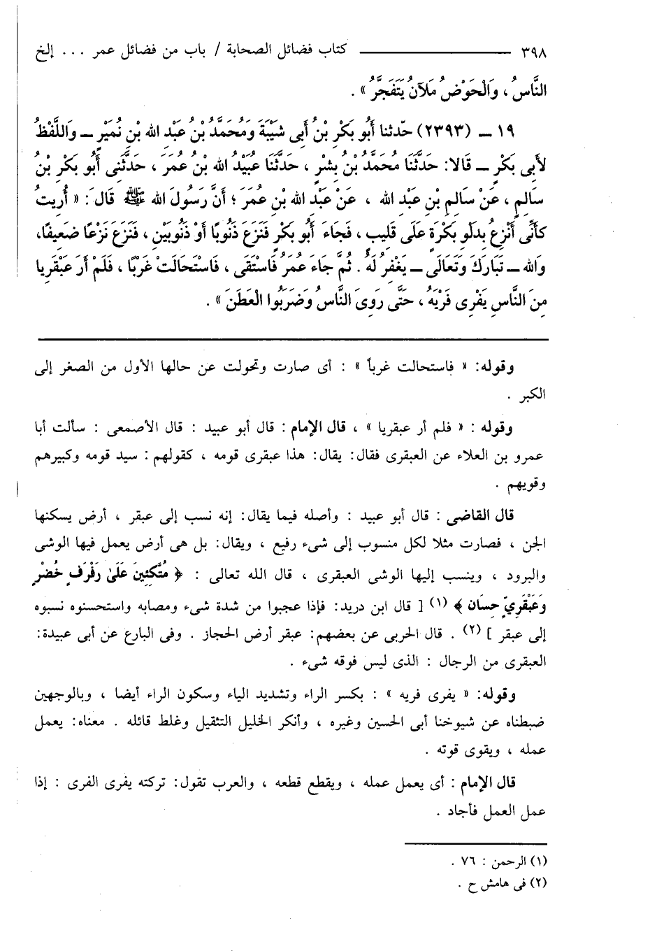 19 - (2393) حدّثنا أَبُو بَكْرِ بْنُ أَبِى شَيْبَةَ وَمُحَمَّدُ بْنُ عَبْدِ اللهِ بْنِ نُمَيْرٍ - وَاللَّفْظُ لأَبِى بَكْرٍ - قَالا: حَدَّثَنَا مُحَمَّدُ بْنُ بِشْرٍ، حَدَّثَنَا عُبَيْدُ اللهِ بْنُ عُمَرَ، حَدَّثَنِى أَبُو بَكْرِ بْنُ سَالِمٍ، عَنْ سَالِمِ بْنِ عَبْدِ اللهِ، عَنْ عَبْدِ اللهِ بْنِ عُمَرَ؛ أَنَّ رَسُولَ اللهِ صَلَّى اللَّهُ عَلَيْهِ وَسَلَّمَ قَالَ: " أُرِيتُ كَأَنِّى أَنْزِعُ بِدَلْوِ بَكْرَةٍ عَلَى قَلِيبٍ، فَجَاءَ أَبُو بَكْرٍ فَنَزَعَ ذَنُوبًا أَوْ ذَنُوبَيْنِ، فَنَزَعَ نَزْعًا ضَعِيفًا، وَالله - تَبَارَكَ وَتَعَالَى - يَغْفِرُ لَهُ. ثُمَّ جَاءَ عُمَرُ فَاسْتَقَى، فَاسْتَحَالَتْ غَرْبًا، فَلَمْ أرَ عَبْقَرِيًّا مِنَ النَّاسِ يَفْرِى فَرْيَهُ، حَتَّى رَوِىَ النَّاسُ وَضَرَبُوا الْعَطَنَ ".