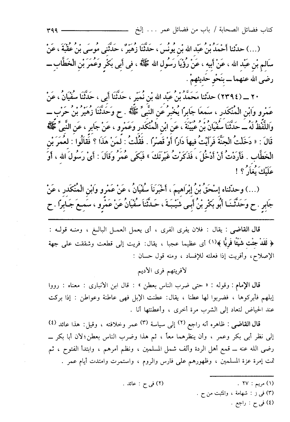 20 - (2394) حدّثنا مَحَمَّدُ بْنُ عَبْدِ اللهِ بْنِ نُمَيْر، حَدَّثَنَا أَبِى، حَدَّثَنَا سُفْيَانُ، عَنْ عَمْرٍو وَابْنِ الْمُنْكَدِرِ، سَمِعَا جَابِرًا يُخْبِرُ عَنِ النَّبِىِّ صَلَّى اللَّهُ عَلَيْهِ وَسَلَّمَ. ح وَحَدَّثَنَا زُهَيْرُ بْنُ حَرْبٍ - وَاللَّفْظُ لَهُ - حَدَّثَنَا سُفْيَانُ بْنُ عُيَيْنَةَ، عَنِ ابْنِ الْمُنْكَدِرِ وَعَمْرٍو، عَنْ جَابِرٍ، عَنِ النَّبِىِّ صَلَّى اللَّهُ عَلَيْهِ وَسَلَّمَ قَالَ: " دَخَلْتُ الْجَنَّةَ فَرَأَيْتُ فِيهَا دَارًا أَوْ قَصْرًا. فَقُلْتُ: لِمَنْ هَذَا؟ فَقَالُوا: لِعُمَرَ بْنِ الْخَطَّابِ. فَأَرَدْتُ أَنْ أَدْخُلَ، فَذَكَرْتُ غَيْرَتَكَ " فَبَكَى عُمَرُ وَقَالَ: أَىْ رَسُولَ اللهِ، أَوَ عَلَيْكَ يُغاَرُ؟!