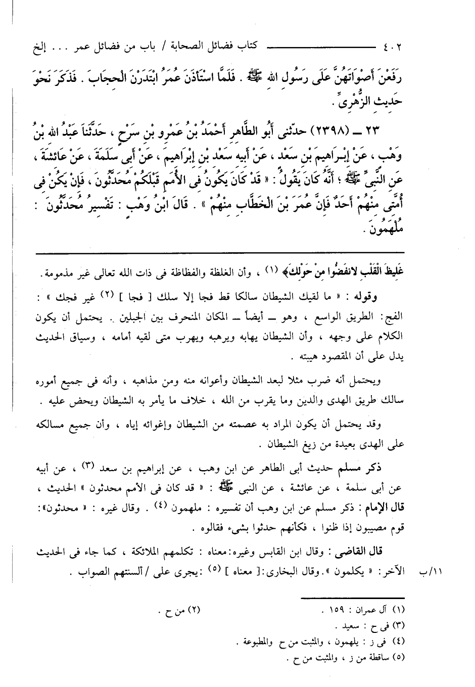 23 - (2398) حدّثنى أَبُو الطَّاهِرِ أَحْمَدُ بْنُ عَمْرِو بْنِ سَرْحٍ، حَدَّثَنَا عَبْدُ اللهِ بْنُ وَهْبٍ، عَنْ إِبْرَاهِيمَ بْنِ سَعْدٍ، عَنْ أَبِيهِ سَعْدِ بْنِ إِبْرَاهِيمَ، عَنْ أَبِى سَلَمَةَ، عَنْ عَائِشَةَ، عَنِ النَّبِىِّ صَلَّى اللَّهُ عَلَيْهِ وَسَلَّمَ؛ أَنَّهُ كَانَ يَقُولُ: " قَدْ كَانَ يَكُونُ فِى الأُمَمِ قَبْلَكُمْ مُحَدَّثُونَ، فَإِنْ يَكُن فِى أُمَّتِى مِنْهُمْ أَحَدٌ فَإِنَّ عُمَرَ بْنَ الْخَطَّابِ مِنْهُمْ ". قَالَ ابْنُ وَهْبٍ: تَفْسِيرُ مُحَدَّثُونَ: مُلْهَمُونَ.