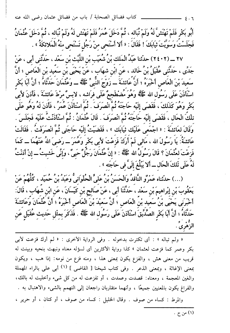 27 - (2402) حدّثنا عَبْدُ الْمَلِكِ بْنُ شُعَيْبِ بْنِ اللَّيْثِ بْنِ سَعْدٍ، حَدَّثَنِى أَبِى، عَنْ جَدِّى، حَدَّثَنِى عُقَيْلُ بْنُ خَالِدٍ، عَنِ ابْنِ شِهَابٍ، عَنْ يَحْيَى بْنِ سَعِيدِ بْنِ الْعَاصِ؛ أَنَّ سَعِيدَ بْنَ الْعَاصِ أَخْبَرَهُ؛ أَنَّ عَائِشَةَ - زَوْجَ النَّبِىِّ صَلَّى اللَّهُ عَلَيْهِ وَسَلَّمَ - وَعُثْمَانَ حَدَّثَاهُ؛ أَنَّ أَبَا بَكْرٍ اسْتَأذَنَ عَلَى رَسُولِ اللهِ صَلَّى اللَّهُ عَلَيْهِ وَسَلَّمَ وَهُوَ مُضْطَجِعٌ عَلَى فِرَاشِهِ، لابِسٌ مِرْطَ عَائِشَةَ، فَأَذِنَ لأَبِى بَكْرٍ وَهُوَ كَذَلِكَ، فَقَضَى إِلَيْهِ حَاجَتَهُ ثُمَّ انْصَرَفَ. ثُمَّ اسْتأذَنَ عُمَرُ، فَأَذِنَ لَهُ وَهُو عَلَى تِلْكَ الْحَالِ، فَقَضَى إِلَيْهِ حَاجَتَهُ ثُمَّ انْصَرَفَ. قَالَ عُثْمَانُ: ثُمَّ اسْتَأذَنْتُ عَلَيْهِ فَجَلَسَ. وَقَالَ لِعَائِشَةَ: " اجْمَعِى عَلَيْكِ ثِيَابَكِ "، فَقَضَيْتُ إِلَيْهِ حَاجَتى ثُمَّ انْصَرَفْتُ. فَقَالَتْ عَائِشَةُ: يَا رَسُولَ اللهِ، مَالِى لَمْ أَرَكَ فَزِعْتَ لأَبِى بَكْرٍ وَعُمَرَ - رَضِىَ اللهُ عَنْهُمَا - كَمَا فَزِعْتَ لِعُثْمَانَ؟ قَالَ رَسُولُ اللهِ صَلَّى اللَّهُ عَلَيْهِ وَسَلَّمَ: " إِنَّ عُثْمَانَ رَجُلٌ حَيِىٌ، وَإنِّى خَشِيتُ - إِنْ أَذِنْتُ لَهُ عَلَى تِلْكَ الْحَالِ - أَلا يَبْلُغَ إِلَىَّ فِى حَاجَتِهِ ".