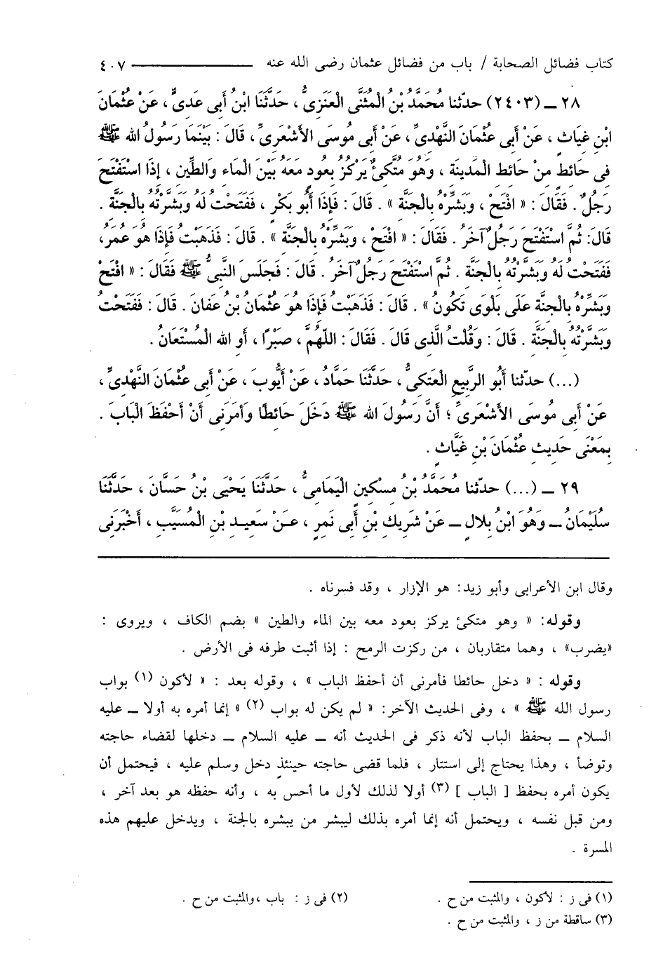 28 - (2403) حدّثنا مُحَمَّدُ بْنُ الْمُثَنَّى الْعَنَزِىُّ، حَدَّثَنَا ابْنُ أَبِى عَدِىٍّ، عَنْ عُثْمَانَ ابْنِ غِيَاثٍ، عَنْ أَبِى عُثْمَانَ النَّهْدِىِّ، عَنْ أَبِى مُوسَى الأَشْعَرِىِّ، قَالَ: بَيْنَمَا رَسُولُ اللهِ صَلَّى اللَّهُ عَلَيْهِ وَسَلَّمَ فِى حَائِطٍ مِنْ حَائِطِ الْمَدِينَةِ، وَهُوَ مُتَّكِئٌ يَرْكُزُ بِعُودٍ مَعَهُ بَيْنَ الْمَاءِ وَالطِّينِ، إِذَا اسْتَفْتَحَ رَجُلٌ. فَقَالَ: " افْتَحْ، وَبَشِّرْهُ بِالْجَنَّةِ ". قَالَ: فَإِذَا أَبُو بَكْرٍ، فَفَتَحْتُ لَهُ وَبَشَّرْتُهُ بِالْجَنَّةِ. قَالَ: ثُمَّ اسْتَفْتَحَ رَجُلٌ آخَرُ. فَقَالَ: " افْتَحْ، وَبَشِّرْهُ بِالْجَنَّةِ ". قَالَ: فَذَهَبْتُ فَإِذَا هُوَ عُمَرُ، فَفَتَحْتُ لَهُ وَبَشَّرْتُهُ بِالْجَنَّةِ. ثُمَّ اسْتَفْتَحَ رَجُلٌ آخَرُ. قَالَ: فَجَلَسَ النَّبِىُّ صَلَّى اللَّهُ عَلَيْهِ وَسَلَّمَ فَقَالَ: " افْتَحْ وَبَشِّرْهُ بِالْجَنَّةِ عَلَى بَلْوَى تَكُونُ ". قَالَ: فَذَهَبْتُ فَإِذَا هُوَ عُثْمَانُ بْنُ عَفَّانَ. قَالَ: فَفَتَحْتُ وَبَشَّرْتُهُ بِالْجَنَّةِ. قَالَ: وَقُلْتُ الَّذِى قَالَ. فَقَالَ: اللهُمَّ، صَبْرًا، أَوِ الله الْمُسْتَعَانُ.