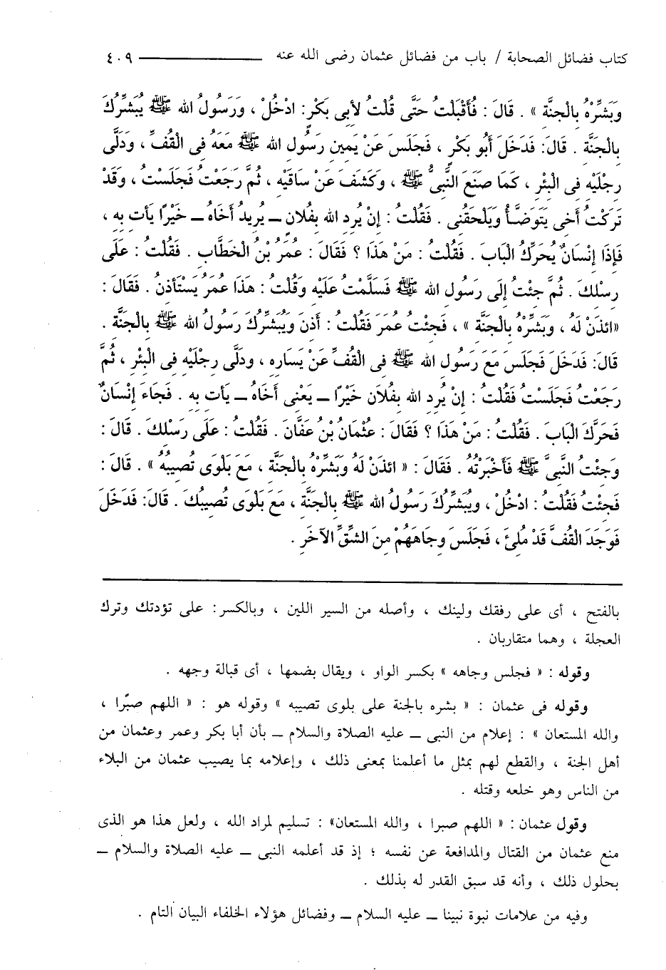 وَبَشِّرْهُ بِالْجَنَّةِ ". قَالَ: فَأَقْبَلْتُ حَتَّى قُلْتُ لأَبِى بَكْرٍ: ادْخُلْ، وَرَسُولُ اللهِ صَلَّى اللَّهُ عَلَيْهِ وَسَلَّمَ يُبَشِّرُكَ بِالْجَنَّةِ. قَالَ: فَدَخَلَ أَبُو بَكْرٍ، فَجَلَسَ عَنْ يَمِينِ رَسُولِ اللهِ صَلَّى اللَّهُ عَلَيْهِ وَسَلَّمَ مَعَهُ فِى الْقُفِّ، وَدَلَّى رِجْلَيْهِ فِى الْبِئْرِ، كَمَا صَنَعَ النَّبِىُّ صَلَّى اللَّهُ عَلَيْهِ وَسَلَّمَ، وَكَشَفَ عَنْ سَاقَيْهِ، ثُمَّ رَجَعْتُ فَجَلَسْتُ، وَقَدْ تَرَكْتُ أَخِى يَتَوَضَّأَ وَيَلْحَقُنِى. فَقُلْتُ: إِنْ يُرِدِ الله بِفُلانٍ - يُرِيدُ أَخَاهُ - خَيْرًا يَأتِ بِهِ، فَإِذَا إِنْسَانٌ يُحَرِّكُ الْبَابَ. فَقُلْتُ: مَنْ هَذَا؟ فَقَالَ: عُمَرُ بْنُ الْخَطَّابِ. فَقُلْتُ: عَلَى رِسْلِكَ. ثُمَّ جِئْتُ إِلَى رَسُولِ اللهِ صَلَّى اللَّهُ عَلَيْهِ وَسَلَّمَ فَسَلَّمْتُ عَلَيْهِ وَقُلْتُ: هَذَا عُمَرُ يَسْتَأذِنُ. فَقَالَ: " ائذَنْ لَهُ، وَبَشَّرْهُ بِالْجَنَّةِ "، فَجِئْتُ عُمَرَ فَقُلْتُ: أَذِنَ وَيُبَشِّرُكَ رَسُولُ اللهِ صَلَّى اللَّهُ عَلَيْهِ وَسَلَّمَ بِالْجَنَّةِ. قَالَ: فَدَخَلَ فَجَلَسَ مَعَ رَسُولِ اللهِ صَلَّى اللَّهُ عَلَيْهِ وَسَلَّمَ فِى الْقُفِّ عَنْ يَسَارِهِ، ودَلَّى رِجْلَيْهِ فِى الْبِئْرِ، ثُمَّ رَجَعْتُ فَجَلَسْتُ فَقُلْتُ: إِنْ يُرِدِ الله بِفُلاَن خَيْرًا - يَعْنِى أَخَاهُ - يَأتِ بِهِ. فَجَاءَ إِنْسَانٌ فَحَرَّكَ الْبَابَ. فَقُلْتُ: مَنْ هَذَا؟ فَقَالَ: عُثْمَانُ بْنُ عَفَّانَ. فَقُلْتُ: عَلَى رَسْلِكَ. قَالَ: وَجِئْتُ النَّبِىَّ صَلَّى اللَّهُ عَلَيْهِ وَسَلَّمَ فَأَخْبَرْتُهُ. فَقَالَ: " ائذَنْ لَهُ وَبَشِّرْهُ بِالْجَنَّةِ، مَعَ بَلْوَى تُصِيبُهُ ". قَالَ: فَجِئْتُ فَقُلْتُ: ادْخُلْ، ويُبَشِّرُكَ رَسُولُ اللهِ صَلَّى اللَّهُ عَلَيْهِ وَسَلَّمَ بِالْجَنَّةِ، مَعَ بَلْوَى تُصِيبُكَ. قَالَ: فَدَخَلَ فَوَجَدَ الْقُفَّ قَدْ مُلِئَ، فَجَلَسَ وِجَاهَهُمْ مِنَ الشِّقِّ الآخَرِ.