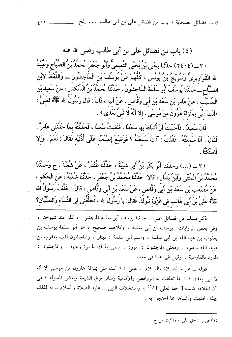 30 - (2404) حدّثنا يَحْيَى بْنُ يَحْيَى التَّمِيمِىُّ وَأَبُو جَعْفَرٍ مُحَمَّدُ بْنُ الصَّبَّاحِ وَعُبَيْدُ اللهِ الْقَوَارِيرِىُّ وَسُرَيْجُ بْنُ يُونُسَ، كُلُّهُمْ عَنْ يُوسُفَ بْنِ الْمَاجشُون - وَاللَّفْظُ لابْنِ الصَّبَّاحِ - حَدَّثَنَا يُوسُفُ أَبُو سَلَمَةَ الْمَاجِشُونُ، حَدَّثَنَا مُحَمَّدُ بْنُ الْمُنْكَدِرِ، عَنْ سَعِيدِ بْنِ الْمُسَيَّبِ، عَنْ عَامِرِ بْنِ سَعْدِ بْنِ أَبِى وَقَّاصٍ، عَنْ أَبِيهِ، قَالَ: قَالَ رَسُولُ اللهِ صَلَّى اللَّهُ عَلَيْهِ وَسَلَّمَ لَعَلِىٍّ: " أَنْتَ مِنِّى بِمَنْزِلَةِ هَارُونَ مِنْ مُوسَى، إِلا أَنَّهُ لا نَبِىَّ بَعْدِى ".