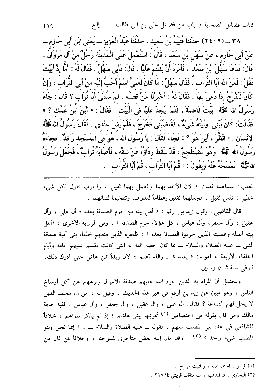 38 - (2409) حدّثنا قُتَيْبَةُ بْنُ سَعِيدٍ، حَدَّثَنَا عَبْدُ الْعَزِيزِ - يَعْنِى ابْنَ أَبِى حَازِمٍ - عَنْ أَبِى حَازِم، عَنْ سَهْلِ بْنِ سَعْدٍ، قَالَ: اسْتُعْمِلَ عَلَى الْمَدِينَةِ رَجُلٌ مِنْ آلِ مَرْوَانَ. قَالَ: فَدَعَا سَهْلَ بْنَ سَعْدٍ، فَأَمَرَهُ أَنْ يَشْتِمَ عَلِيًّا. قَالَ: فَأَبِى سَهْلٌ. فَقَالَ لَهُ: أَمَّا إِذْ أَبَيْتَ فَقُلْ: لَعَنَ الله أَبَا التُّرابِ. فَقَالَ سَهْلٌ: مَا كَانَ لِعَلِىٍّ اسْمٌ أَحَبَّ إِلَيْهِ مِنْ أَبِى التُّرَابِ، وَإِنْ كَانَ لَيَفْرَحُ إِذَا دُعِىَ بِهَا. فَقَالَ لَهُ: أَخْبِرْنَا عَنْ قِصَّتِهِ. لِمَ سُمِّىَ أَبَا تُرَابٍ؟ قَالَ: جَاءَ رَسُولُ اللهِ صَلَّى اللَّهُ عَلَيْهِ وَسَلَّمَ بَيْتَ فَاطِمَةَ، فَلَمْ يَجِدْ عَلِيًّا فِى الْبَيْتَ. فَقَالَ: " أَيْنَ ابْنُ عَمِّكِ؟ " فَقَالَتْ: كَانَ بَيْنِى وَبَيْنَهُ شَىْءٌ، فَغَاضَبَنِى فَخَرَجَ، فَلَمْ يَقِلْ عِنْدِى. فَقَالَ رَسُولُ اللهِ صَلَّى اللَّهُ عَلَيْهِ وَسَلَّمَ لإِنْسَانٍ: " انْظُرْ، أَيْنَ هُوَ؟ " فَجَاءَ فَقَالَ: يَا رسُولَ اللهِ، هُوَ فِى الْمَسْجِدِ رَاقِدٌ. فَجَاءَهُ رَسُولُ اللهِ صَلَّى اللَّهُ عَلَيْهِ وَسَلَّمَ وَهُوَ مُضْطَجِعٌ، قَدْ سَقَطَ رِدَاؤُهُ عَنْ شِقِّهِ، فَأَصَابَهُ تُرابٌ، فَجَعَلَ رَسُولُ اللهِ صَلَّى اللَّهُ عَلَيْهِ وَسَلَّمَ يَمْسَحُهُ عَنْهُ وَيقُولُ: " قُمْ أَبَا التُّرَابِ، قُمْ أَبَا التُّرَابِ ".